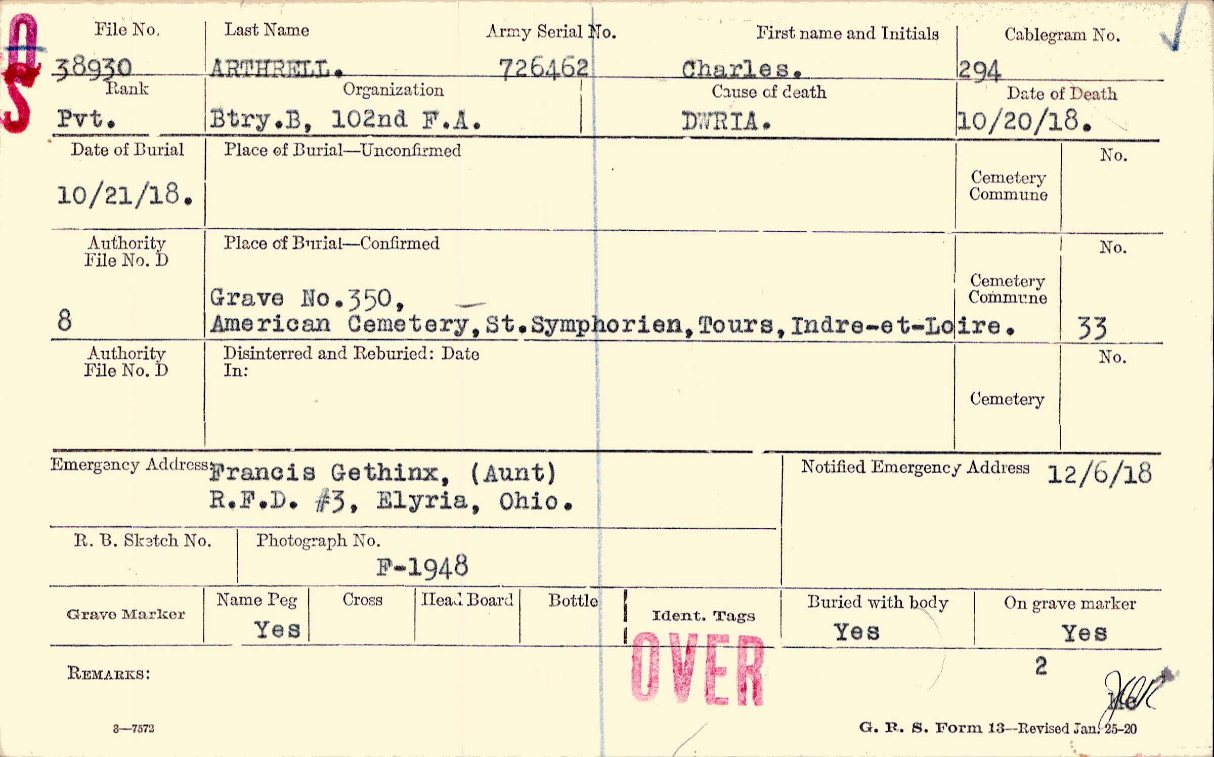Grave 350, American Cemetery, St. Symphorien, Tours, Indre-et-Loire.