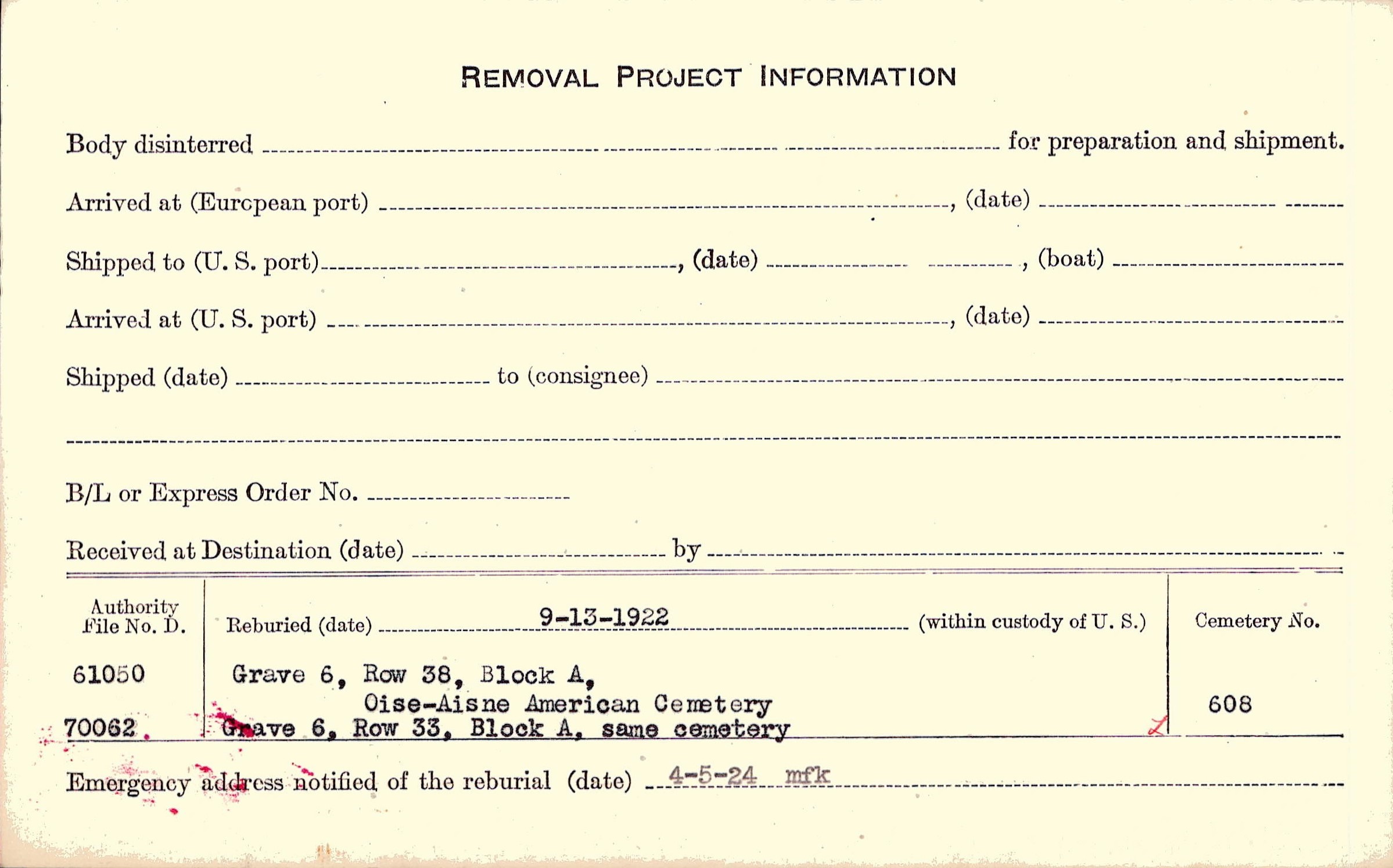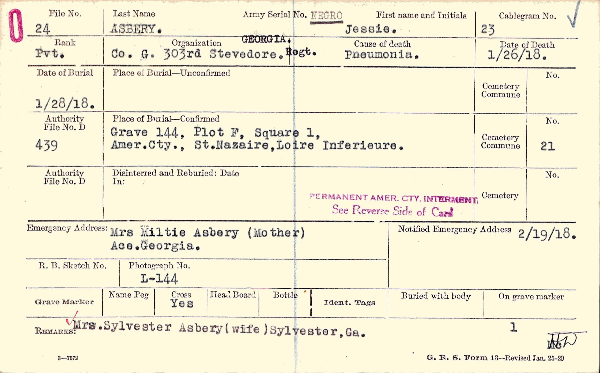 Grave 144, Plot F, Square 1, Amer. Cty. , St. Nazaire, Loire Inferieure.