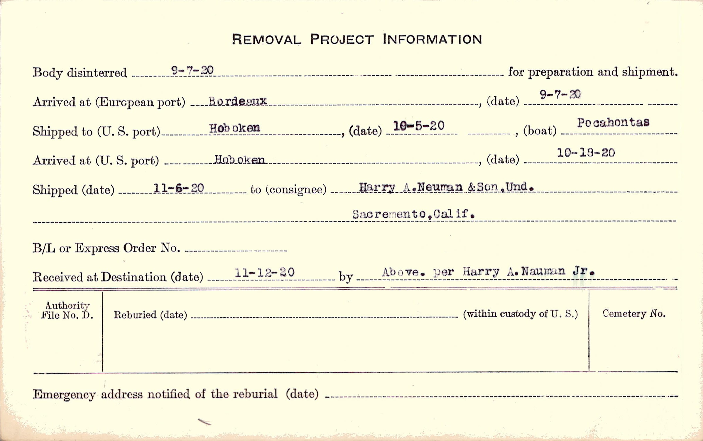 Body disinterred 9/7/1920 for preparation and shipment.