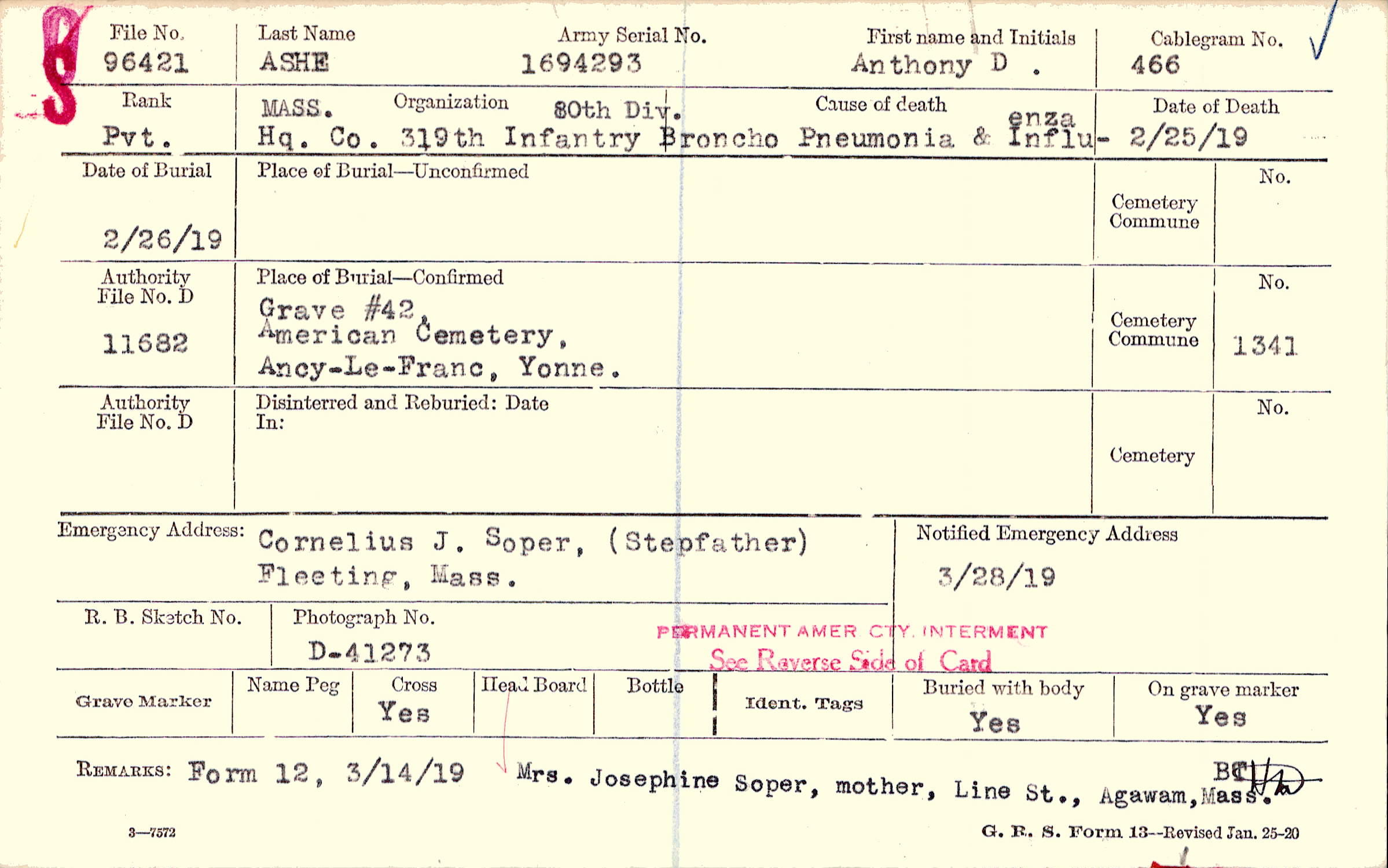 Grave #42, American Cemetery, Ancy-Le-Franc, Yonne.