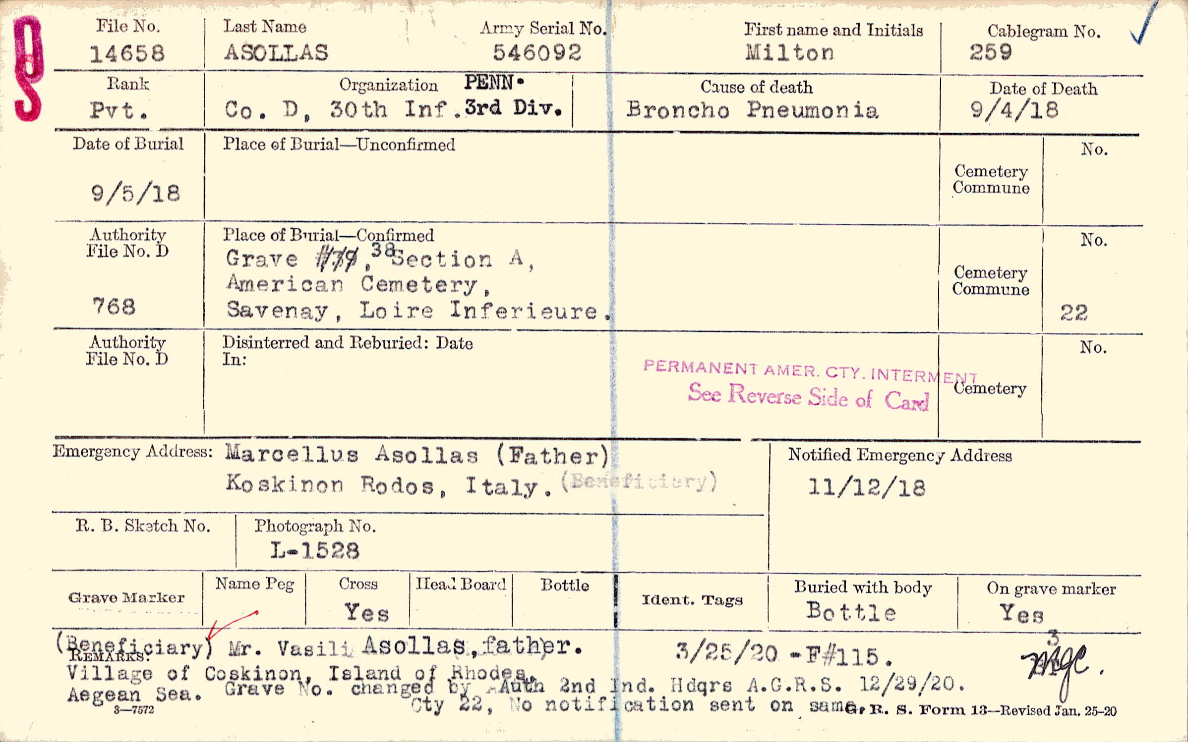 Marcellus Asollas (Father), Koskinon Rodos, Italy, (Beneficiary)