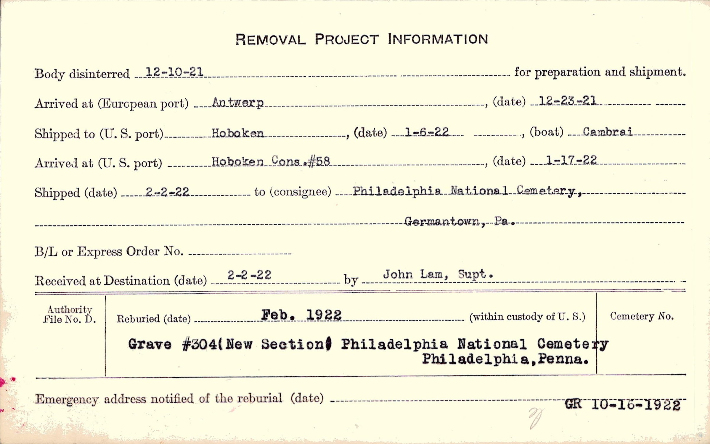 Body disinterred 12/10/1921 for preparation and shipment.