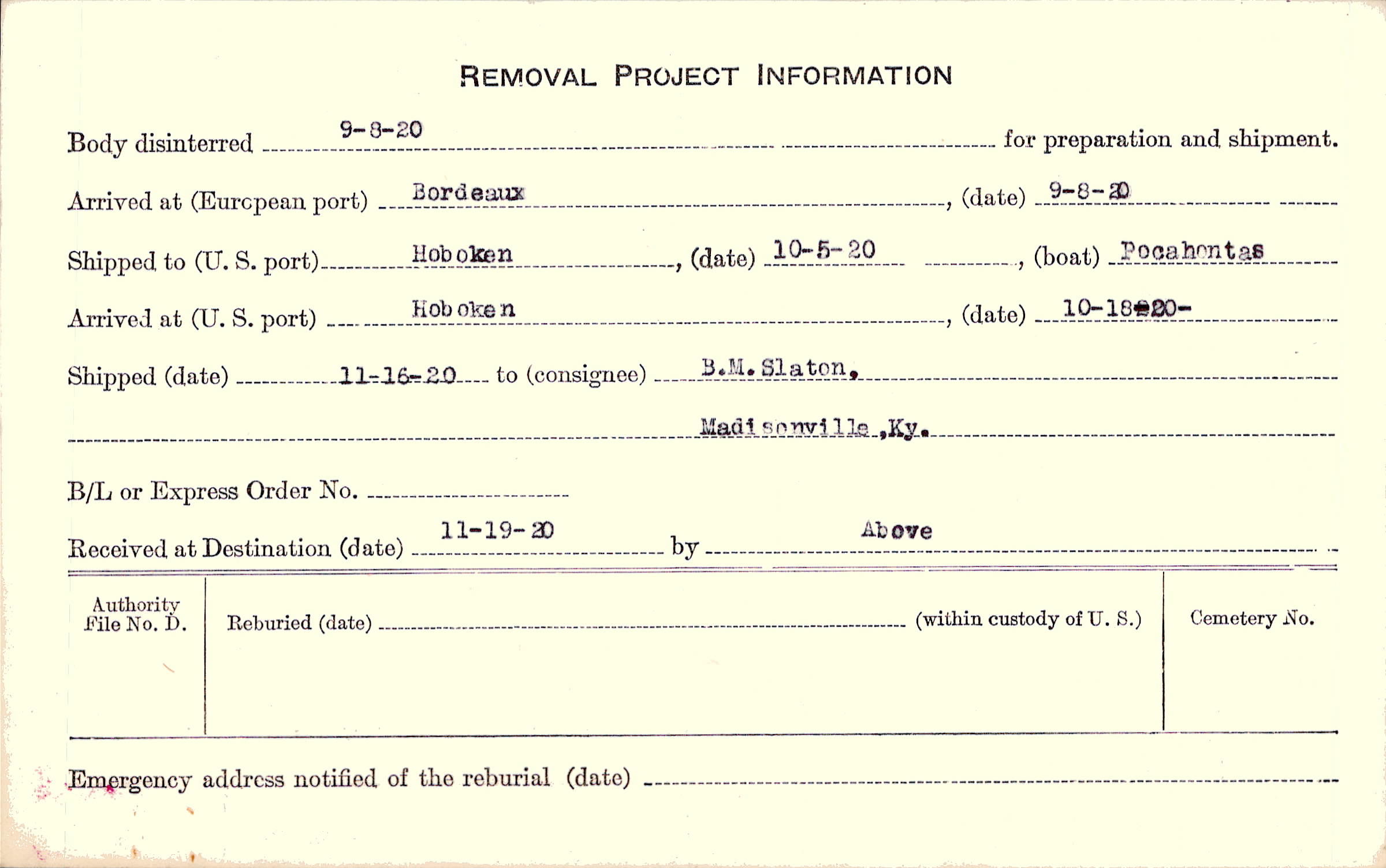Body disinterred 9/8/1920 for preparation and shipment.