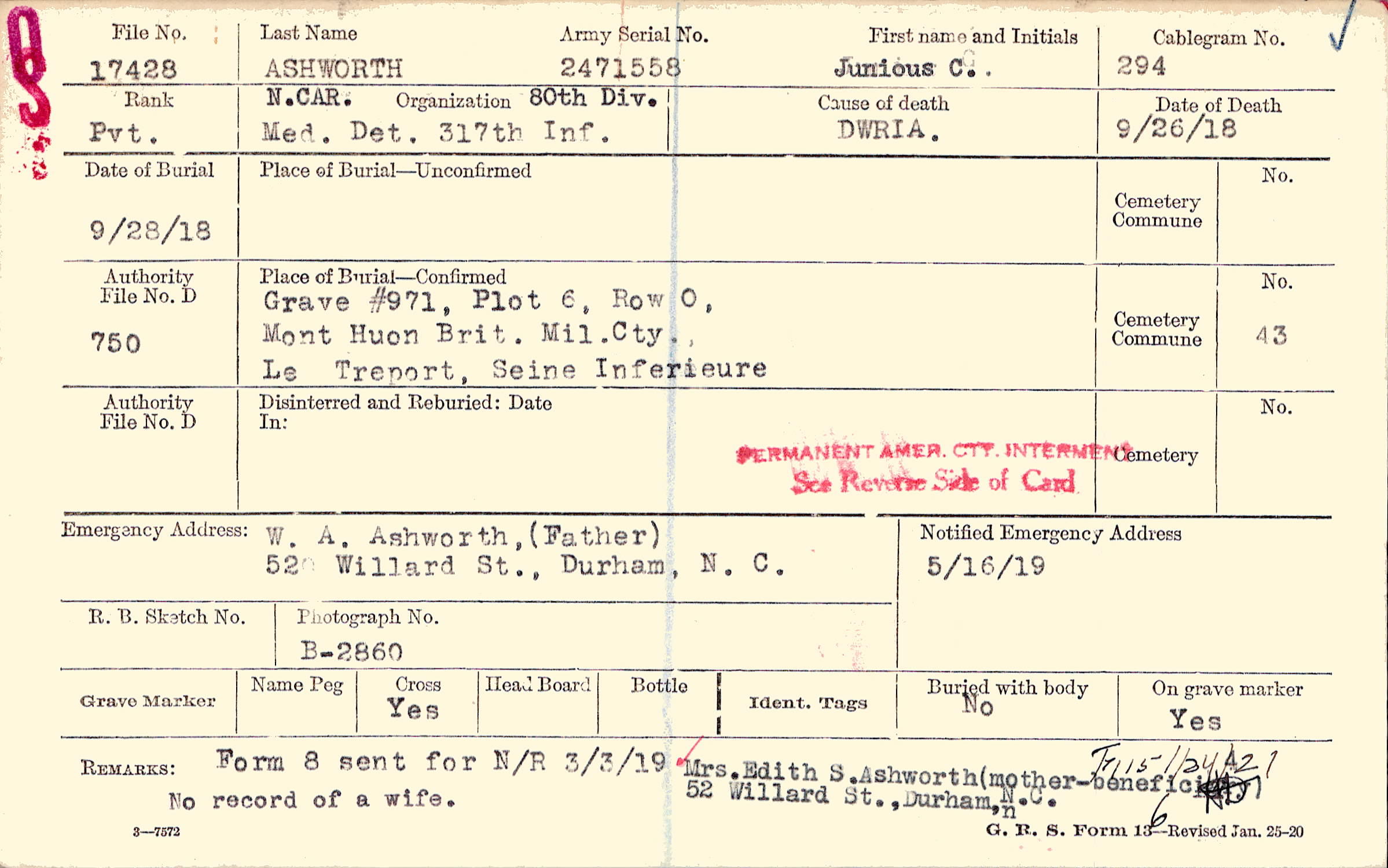 W. A. Ashworth, (Father), 520 Willard St., Durham, N. C.
