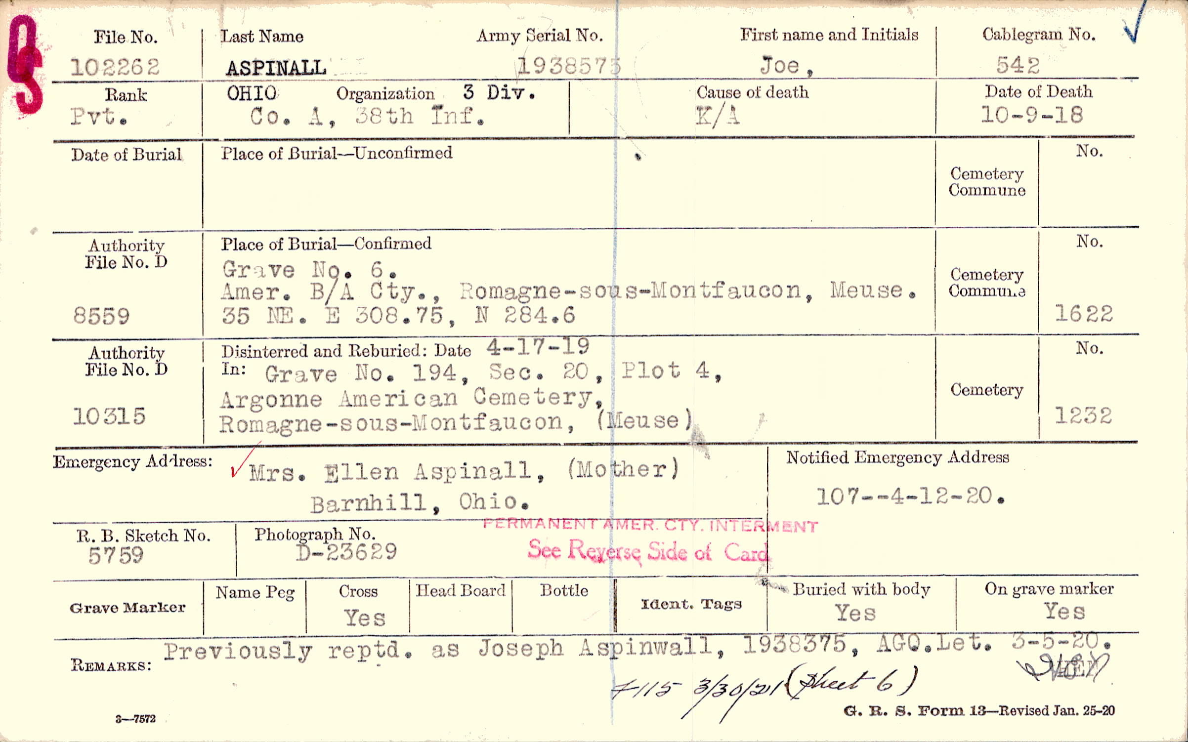 Previously reptd. as Joseph Aspinwall, 1938375, AGO. Let. 3-5-20., F115 3/30/21 (Sheet 6)