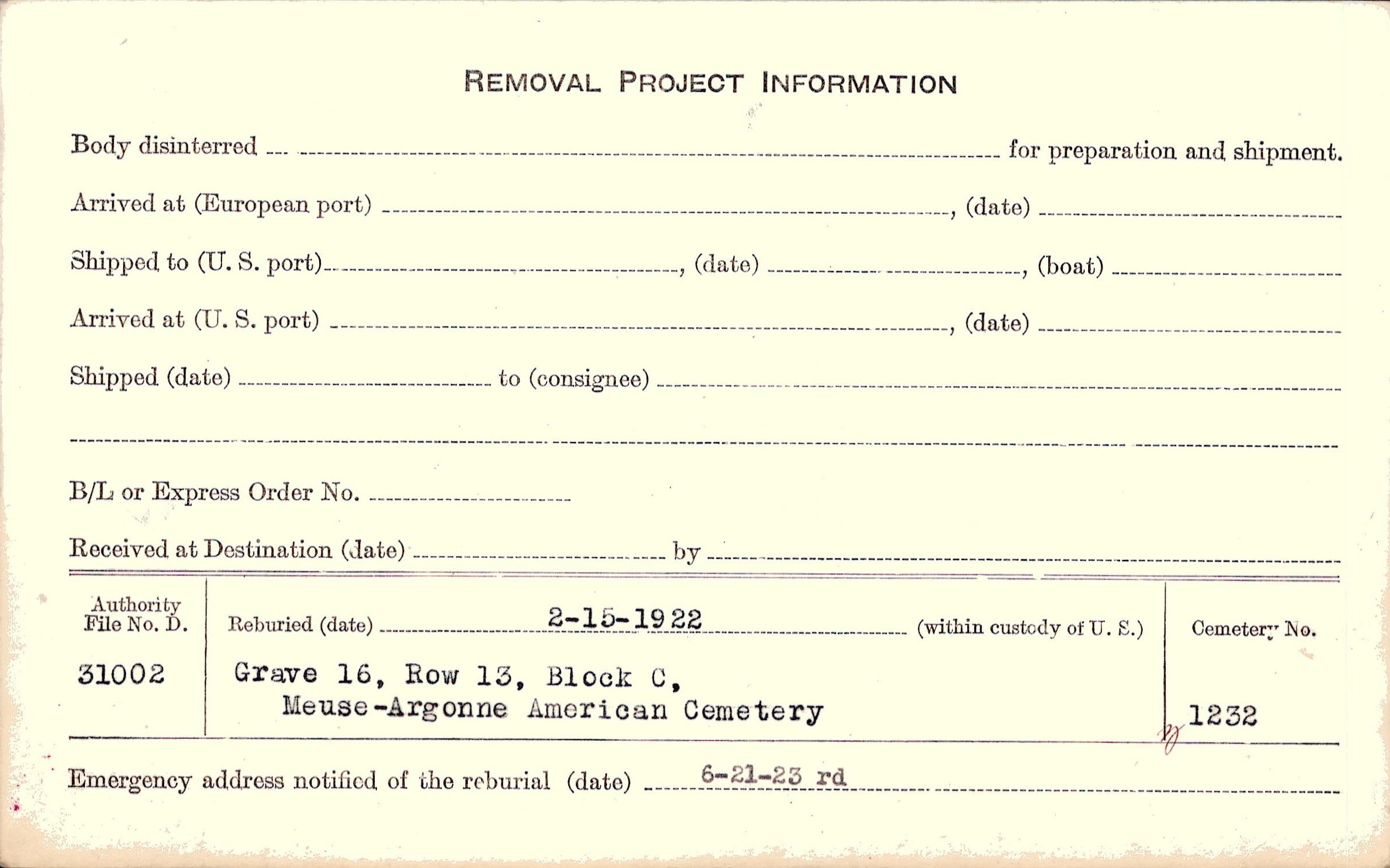 | Permanent Burial in Foreign Cemetery |