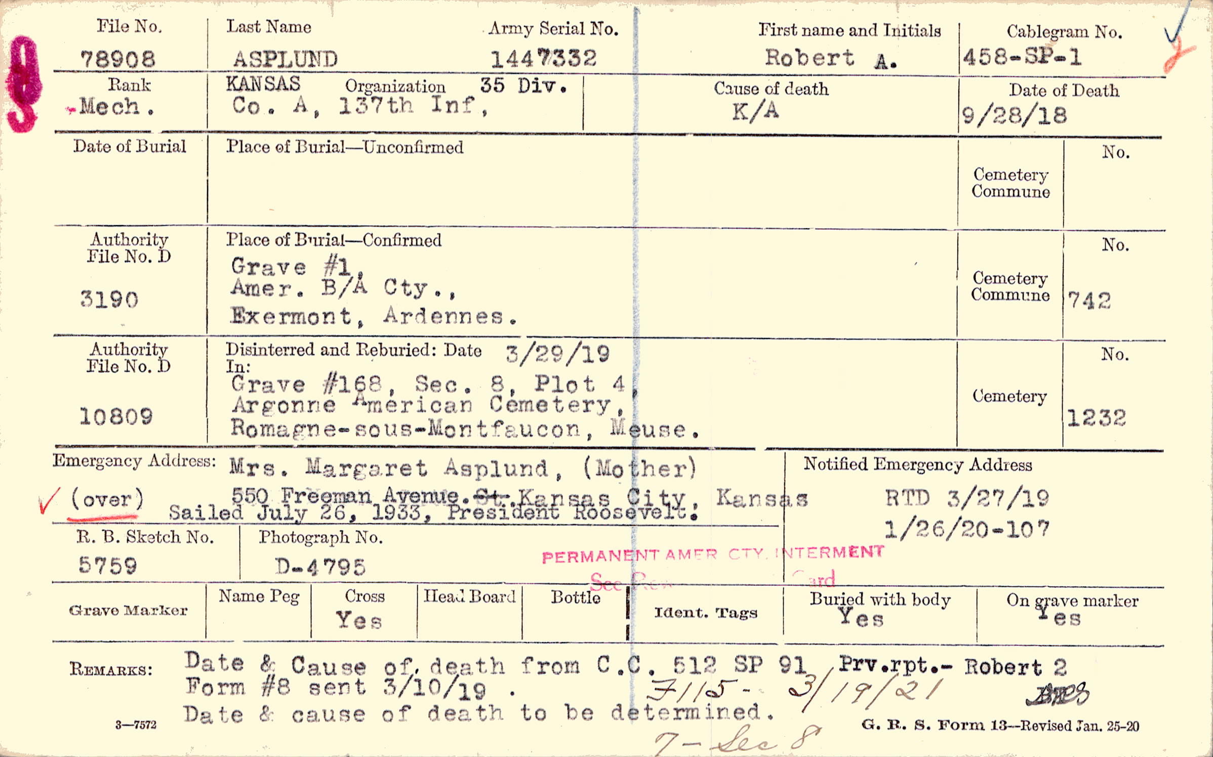 Grave 168, Section 8, Plot 4, Argonne American Cemetery, Romagne-sous-Montfaucon, Meuse