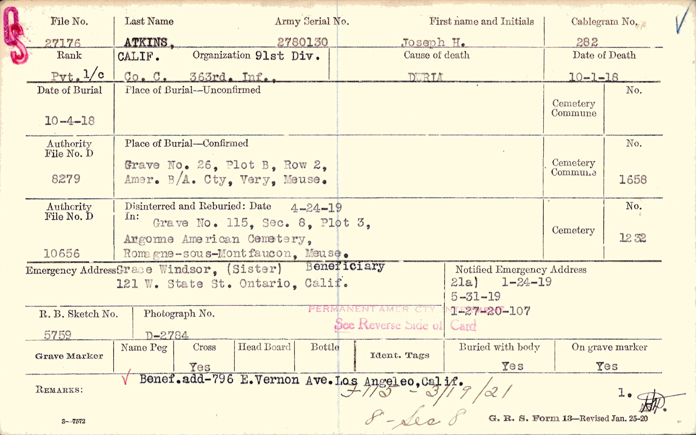 Grave 115, Section 8, Plot 3, Argonne American Cemetery, Romagne-sous-Montfaucon, Meuse