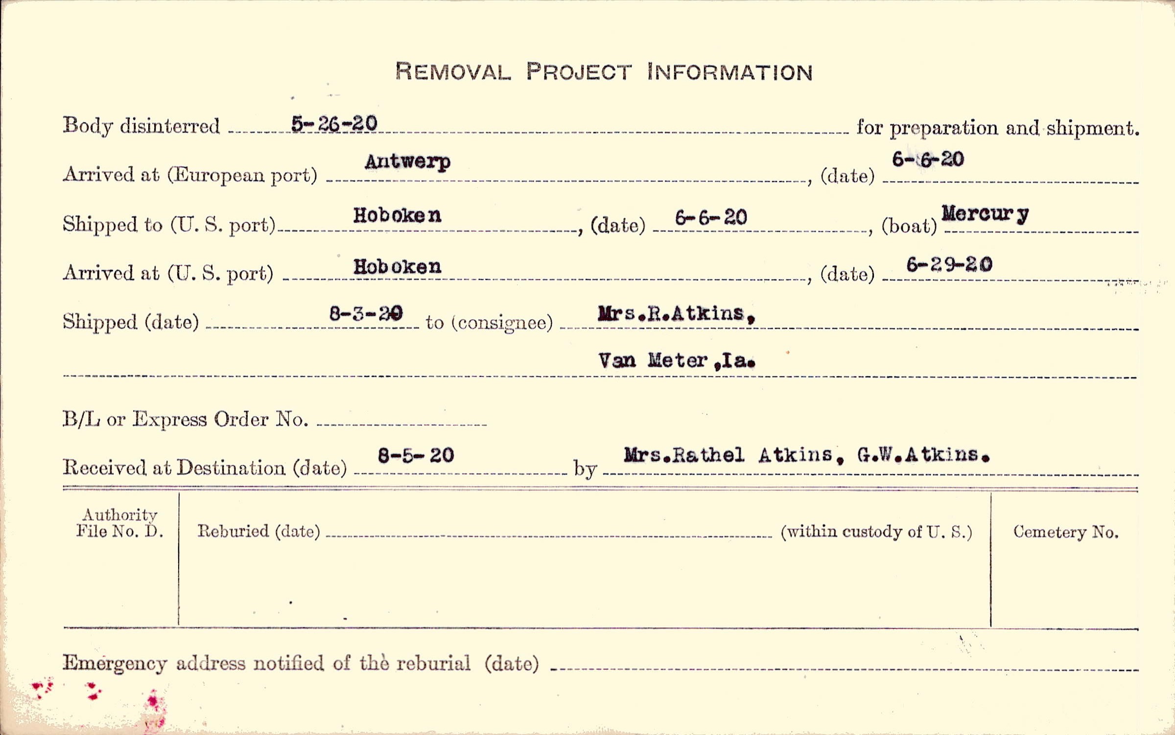 Body disinterred 5/26/1920 for preparation and shipment.