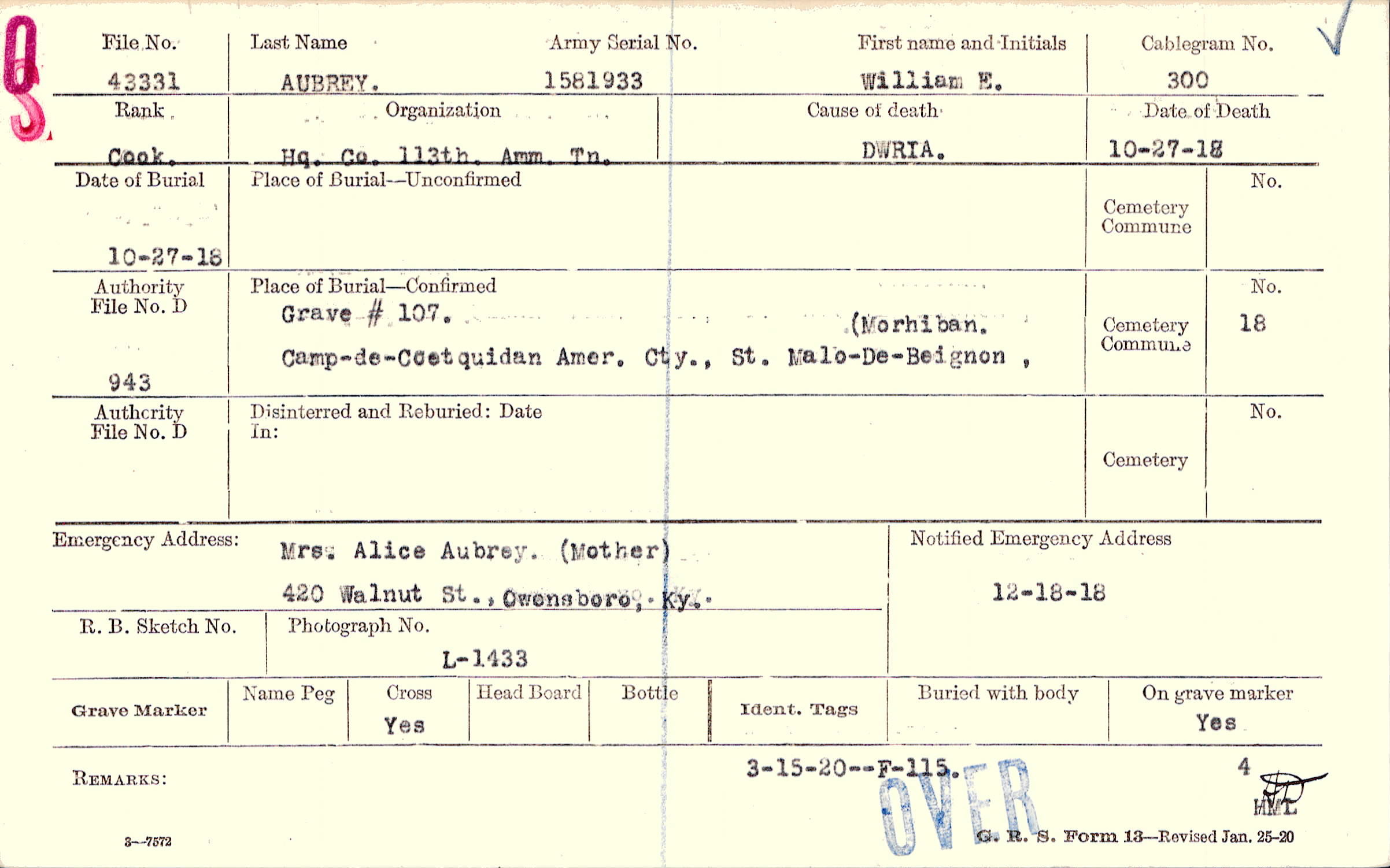 Mrs. Alice Aubrey. (Mother), 420 Walnut St., Owensboro, Ky., 3-15-20--F-115