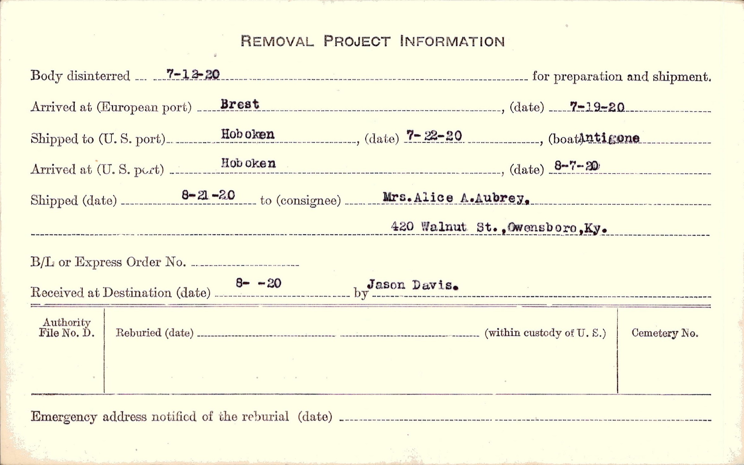 Body disinterred 7/12/1920 for preparation and shipment.