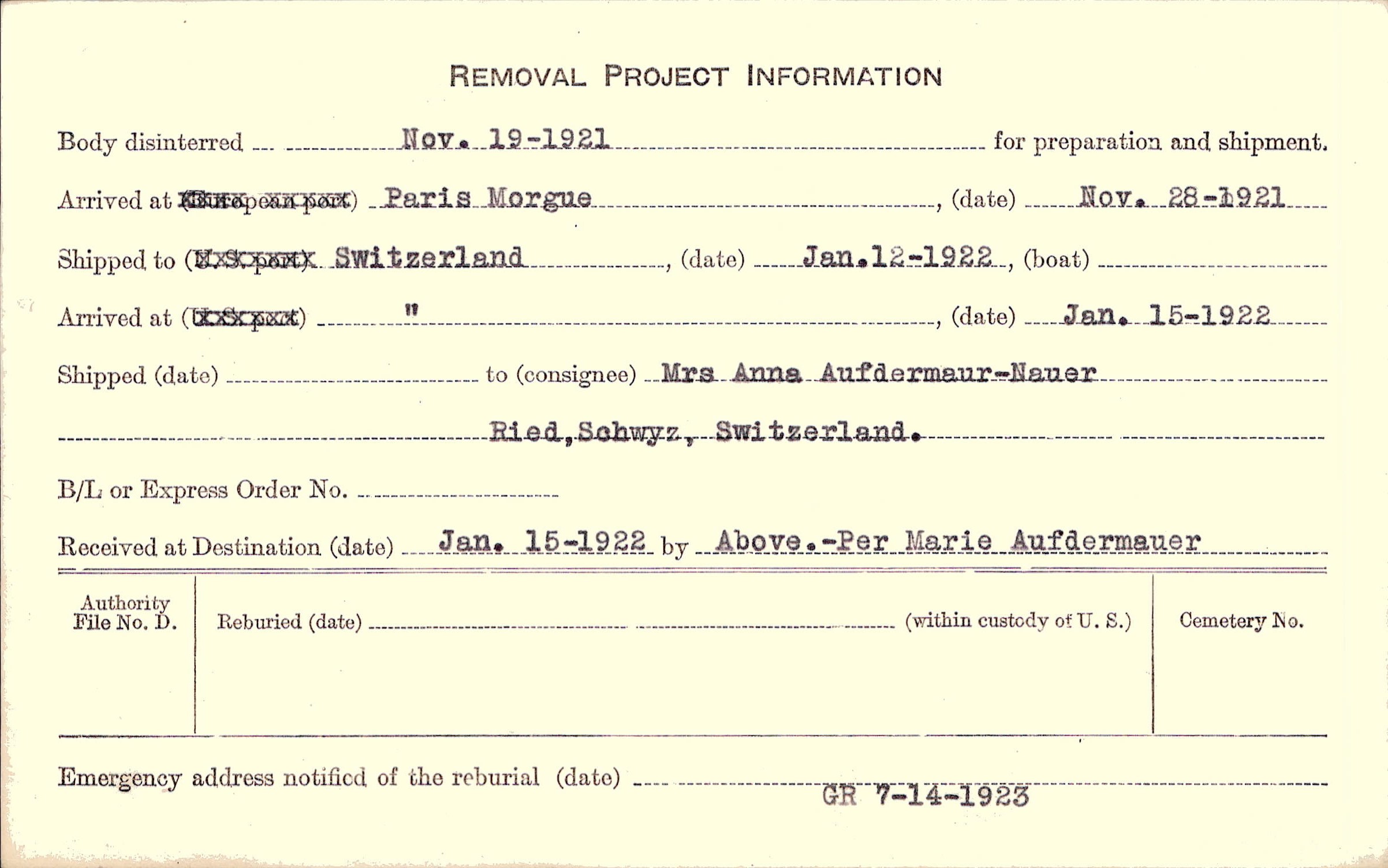 to Mrs. Anna Aufdermaur-Nauer, Ried, Schwyz, Switzerland
