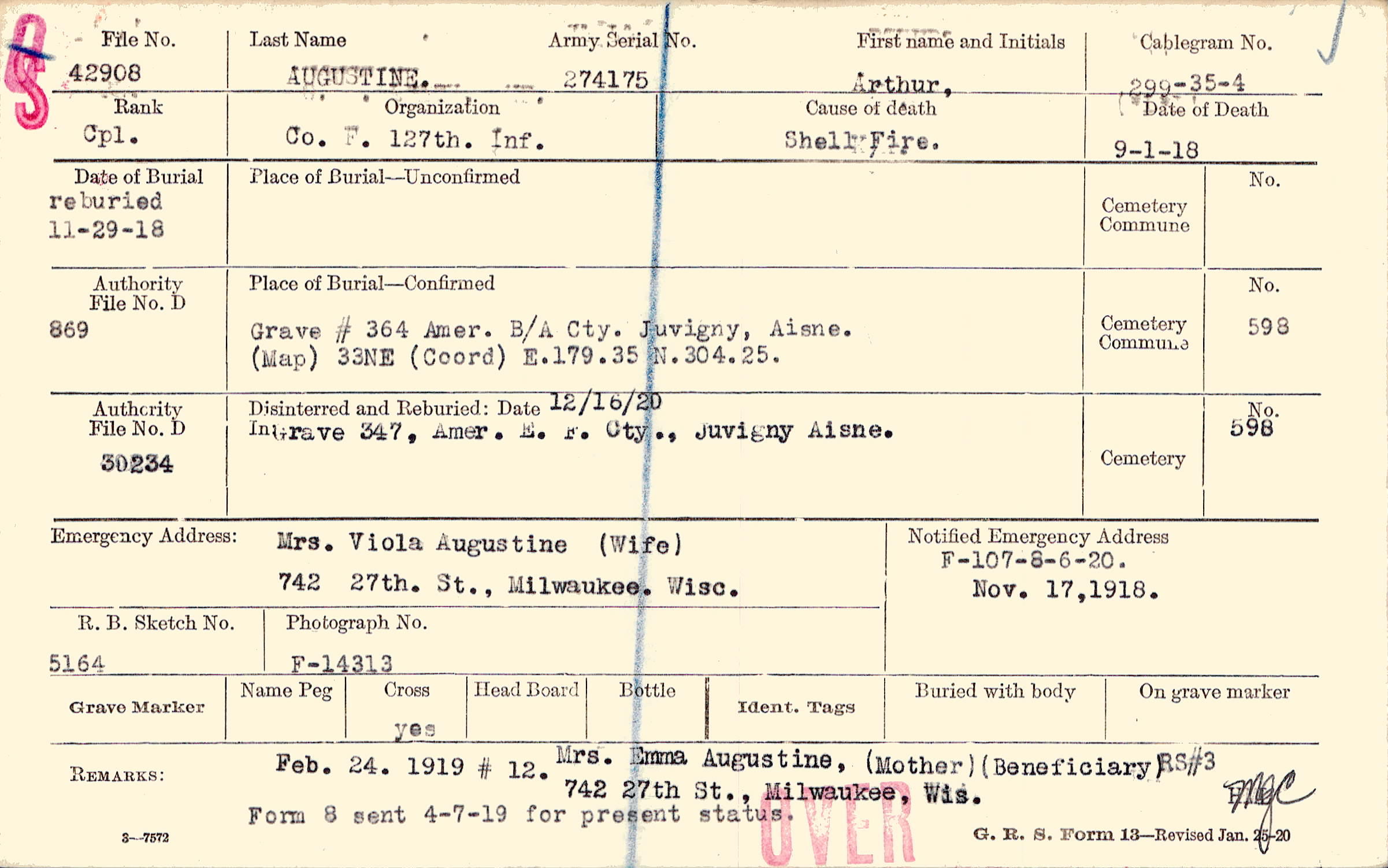 Mrs. Emma Augustine, (Mother), (Beneficiary), RS#3, 742 27th St. Milwaukee, Wis., Form 8 sent 4-7-19 for present status., Feb. 24. 1919 # 12
