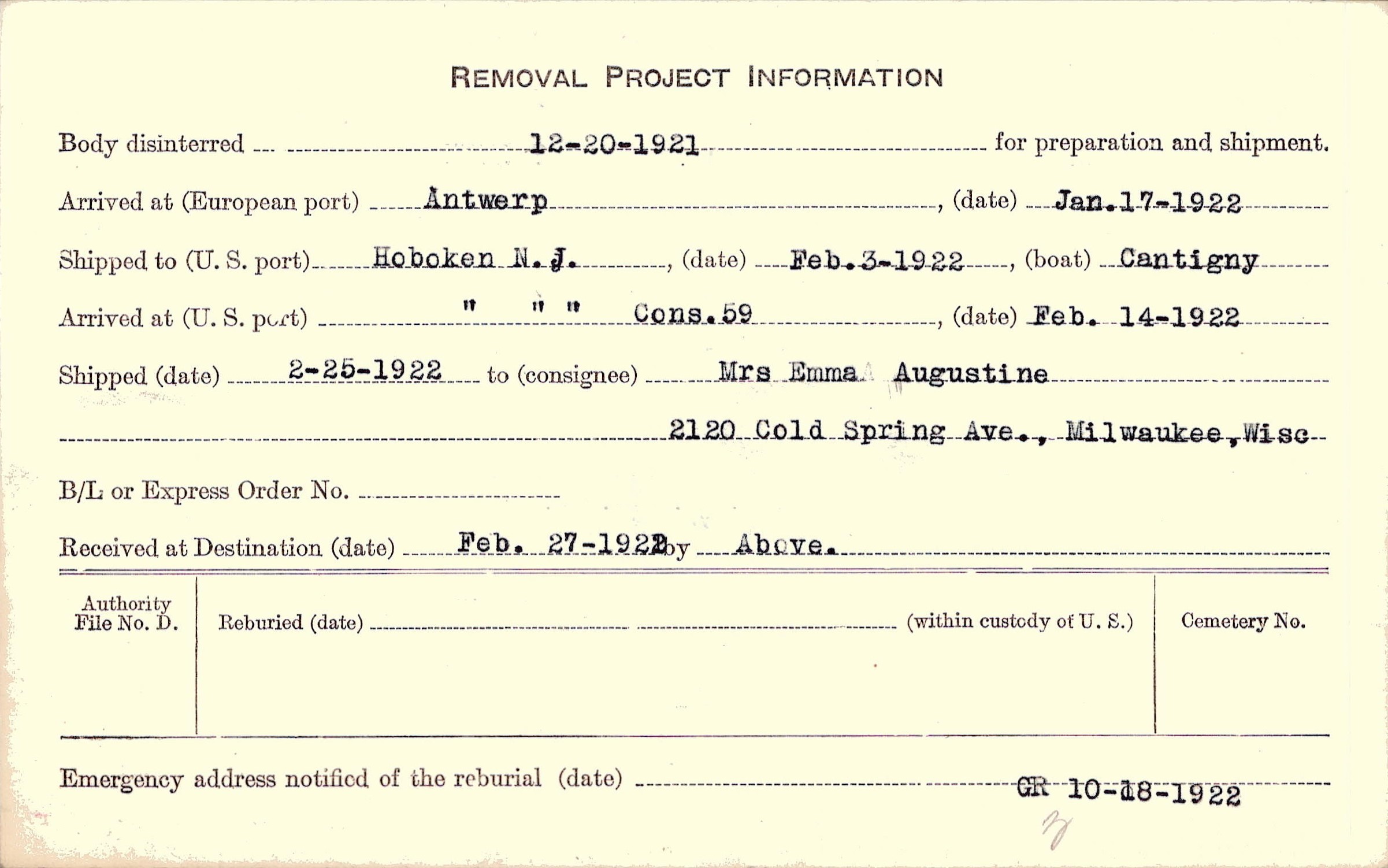 Body disinterred 12/20/1921 for preparation and shipment.