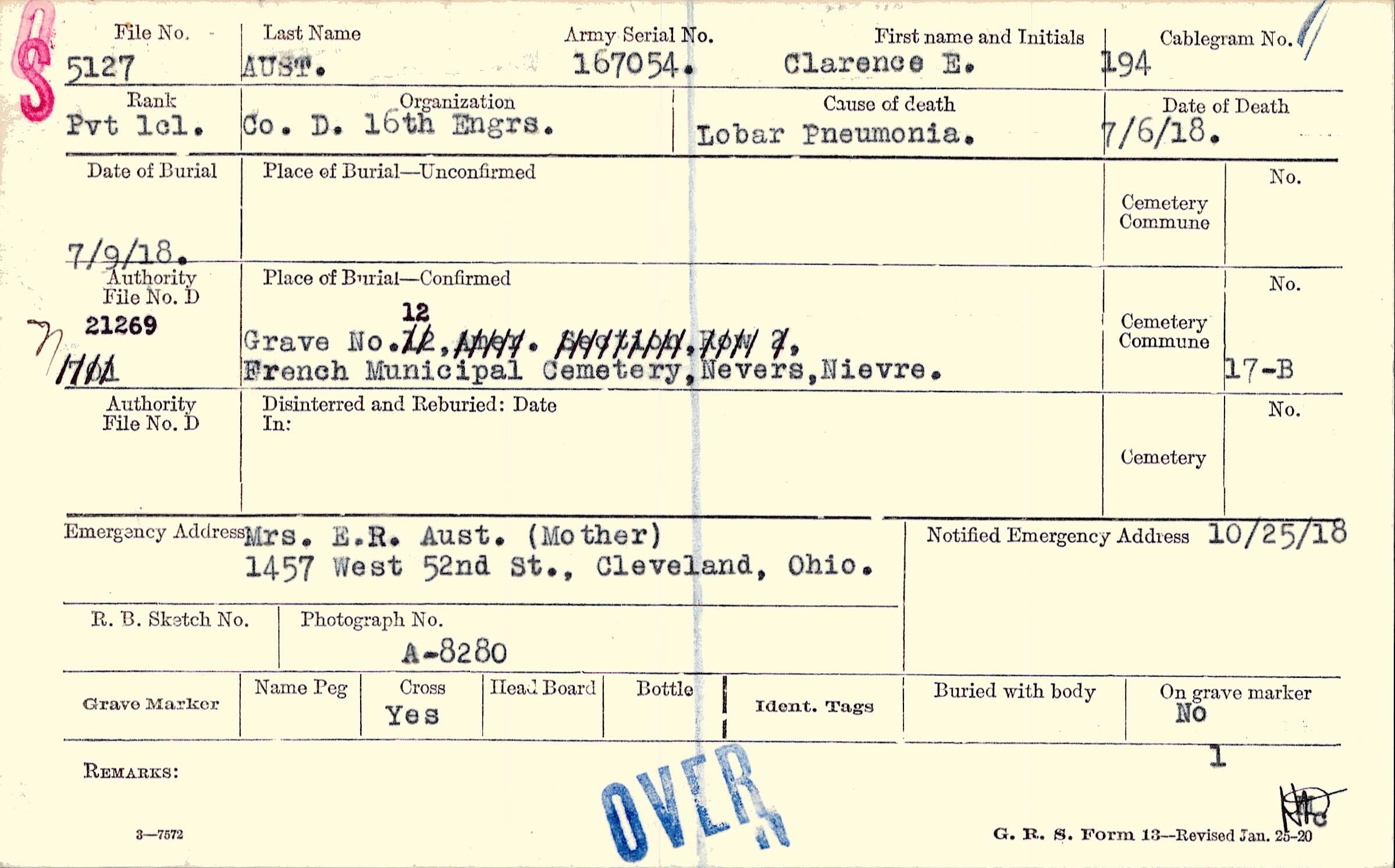Mrs. E.R. Aust. (Mother), 1457 West 52nd St., Cleveland, Ohio.