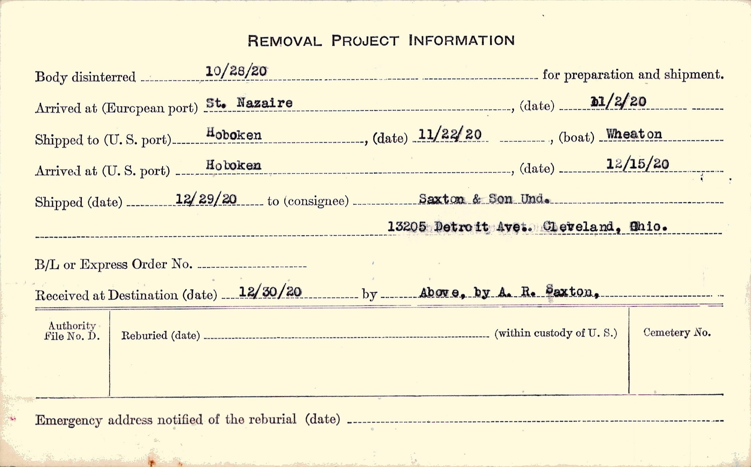 Body disinterred 10/28/1920 for preparation and shipment.