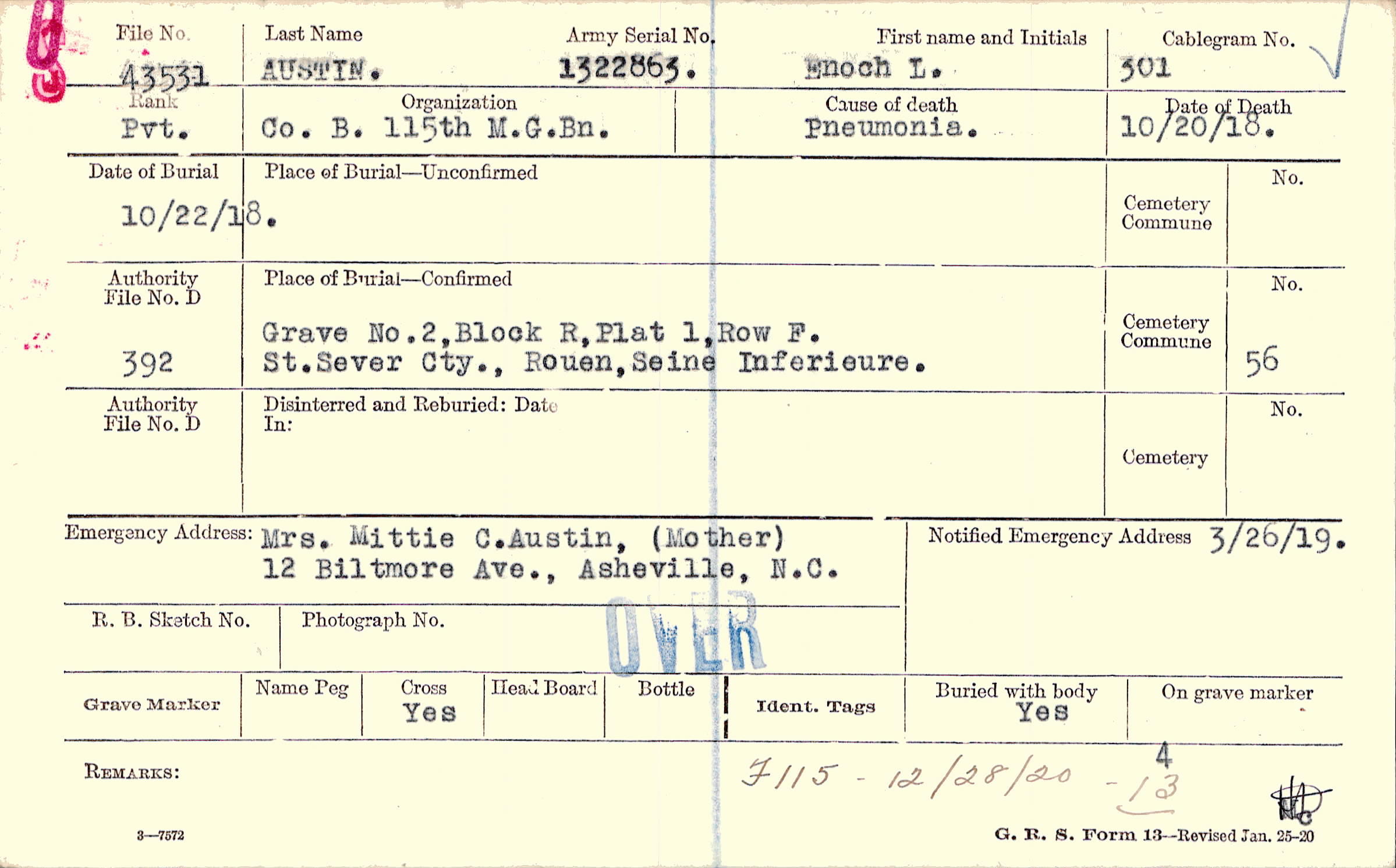 Grave 2, Block R, Plat 1, Row F., St.Sever Cty., Rouen, Seine Inferieure.
