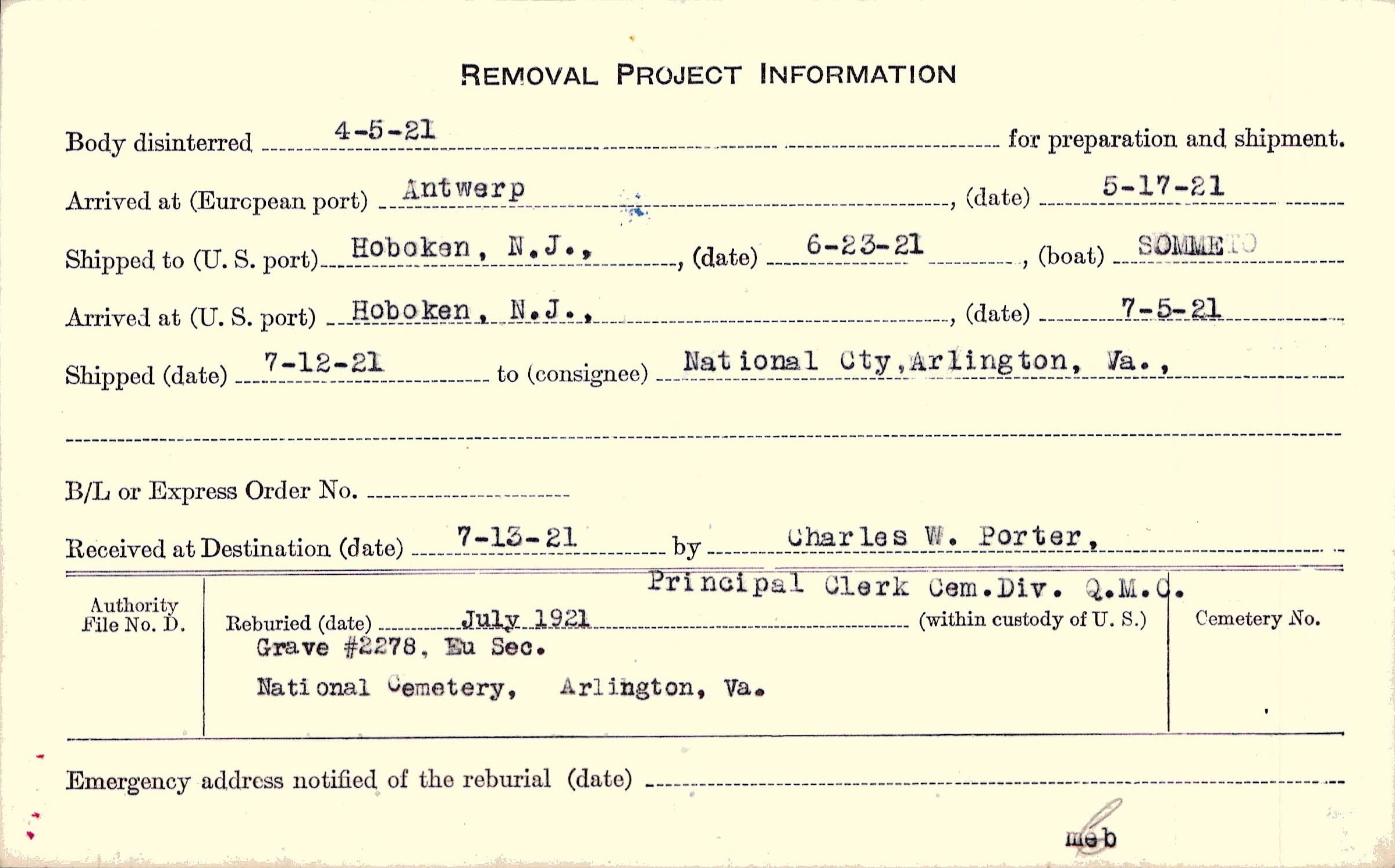 by Charles W. Porter, Principal Clerk Cem. Div. Q.M.C.