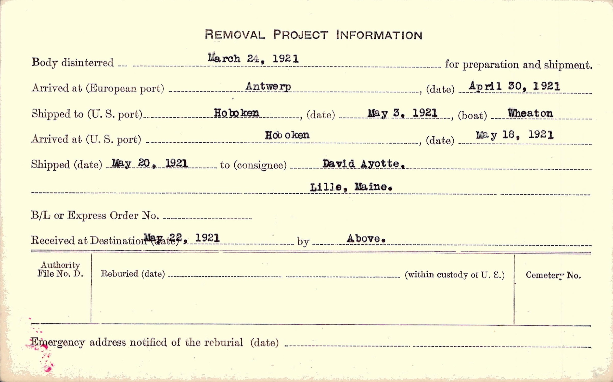 Body disinterred 3/24/1921 for preparation and shipment.
