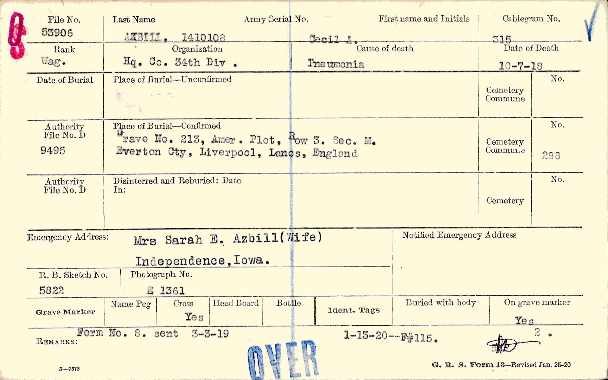 Grave 213, Amer. Plot, Row 3, Sec. M., Everton Cty, Liverpool, Lancs, England