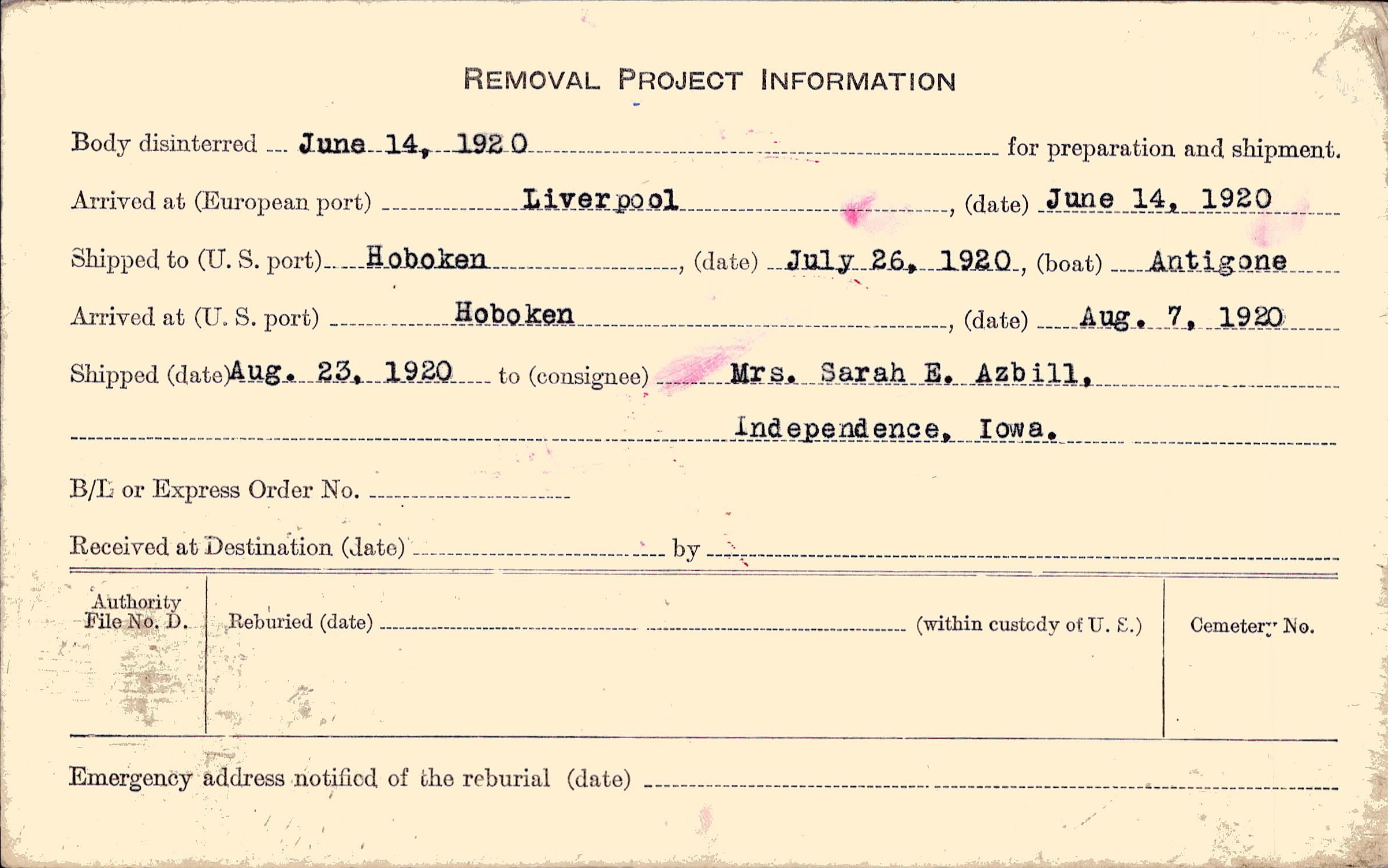 Body disinterred 6/14/1920 for preparation and shipment.