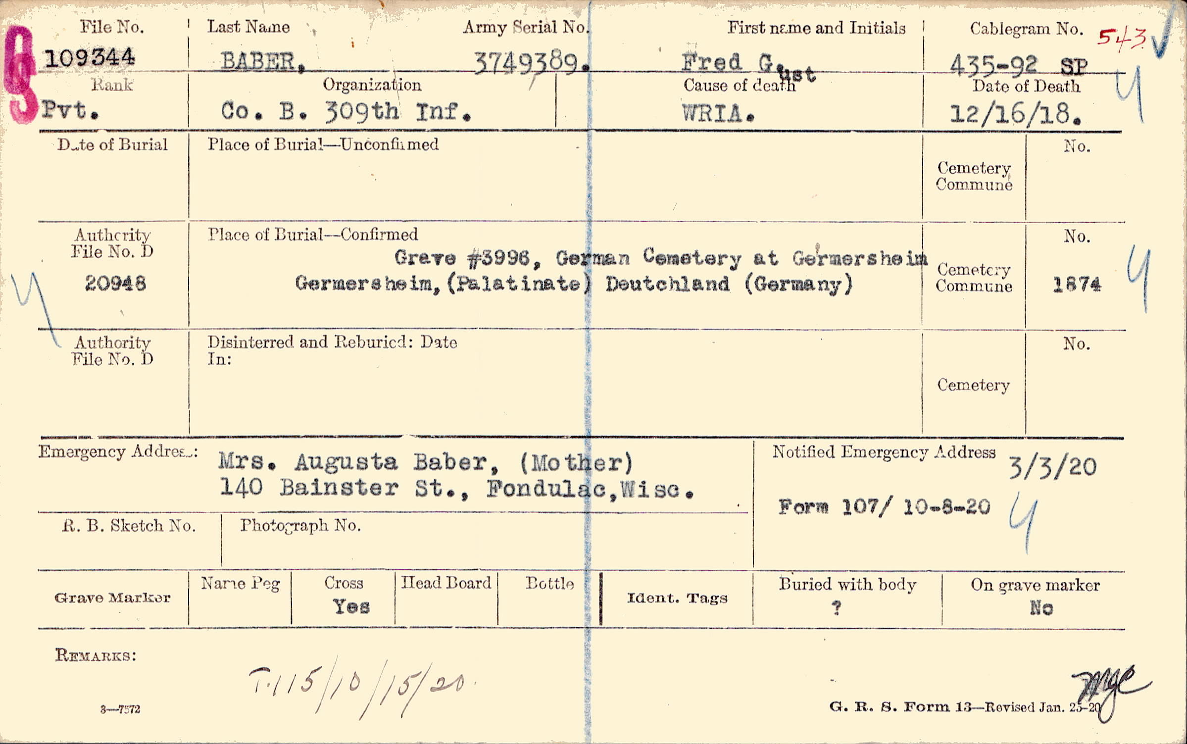 Mrs. Augusta Baber, (Mother), 140 Bainster St., Fondulac, Wisc.