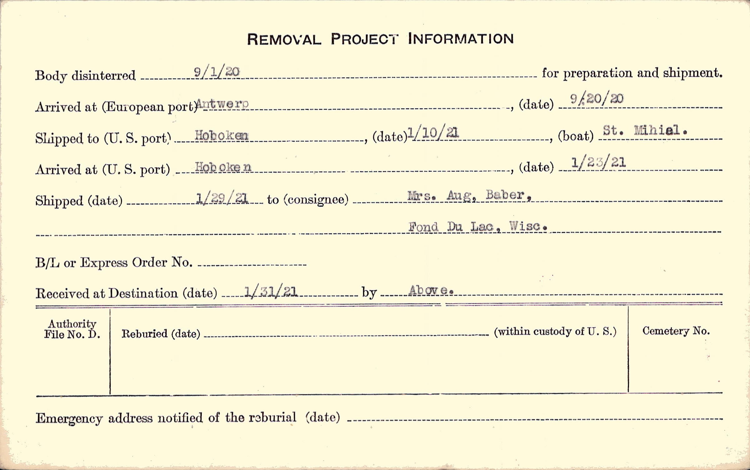 Body disinterred 9/1/1920 for preparation and shipment.