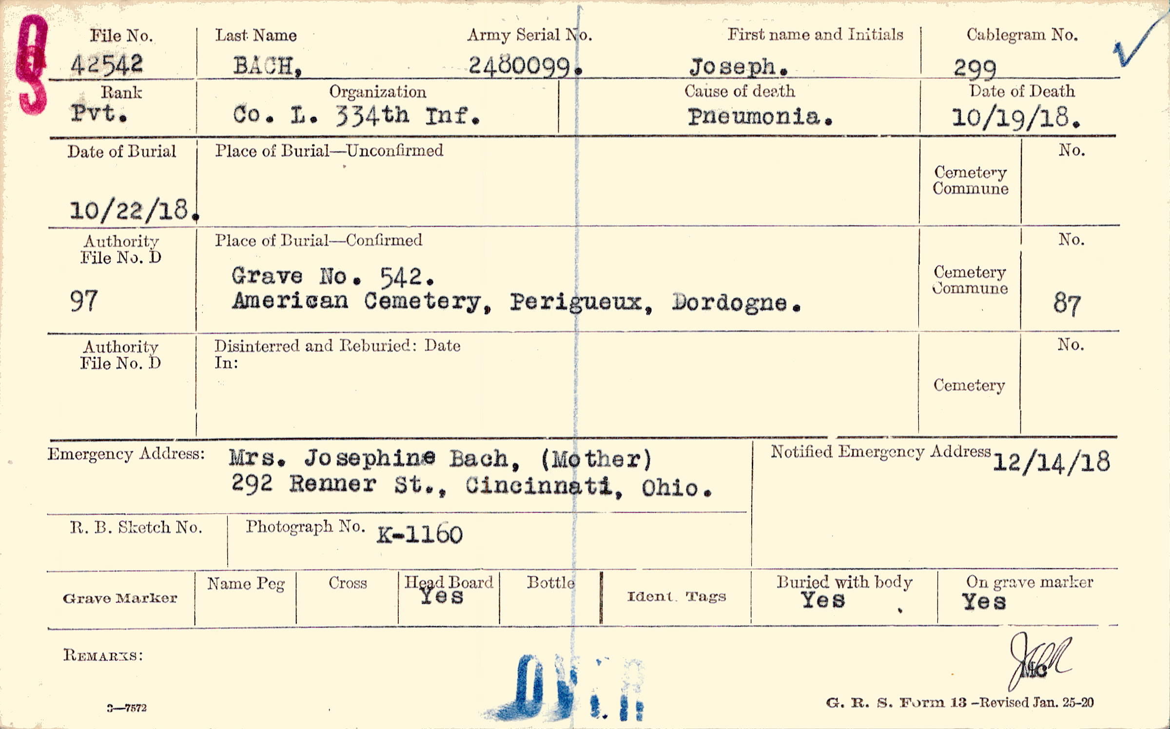 Mrs. Josephine Bach, (Mother), 292 Renner St., Cincinnati, Ohio.