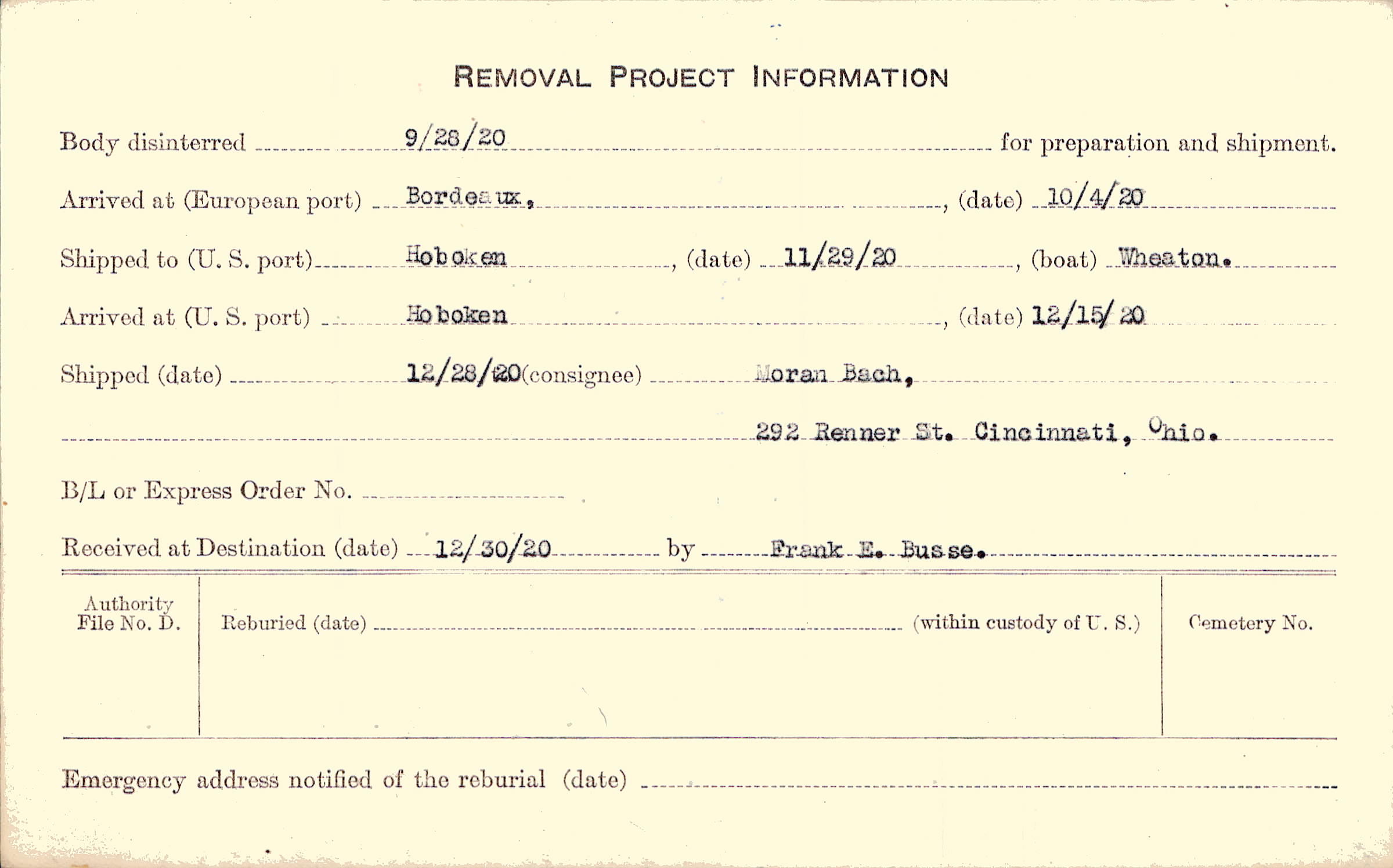 Body disinterred 9/28/1920 for preparation and shipment.