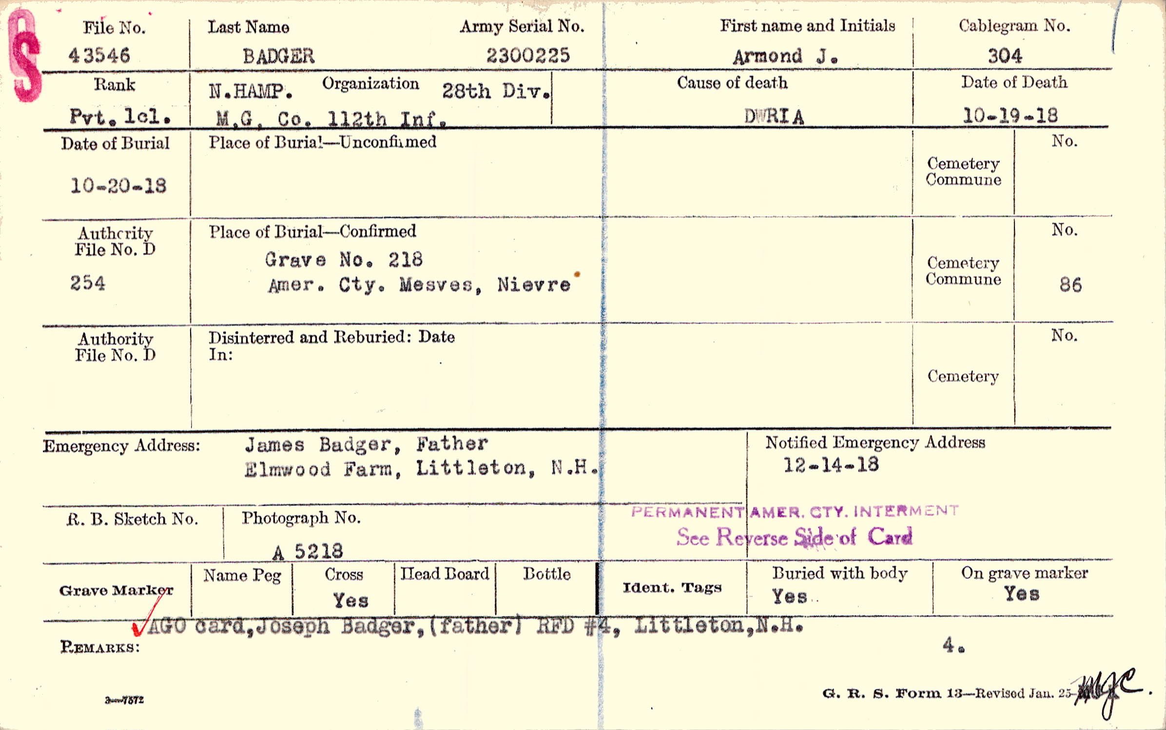 Grave 218, Amer. Cty., Mesves, Nievre.