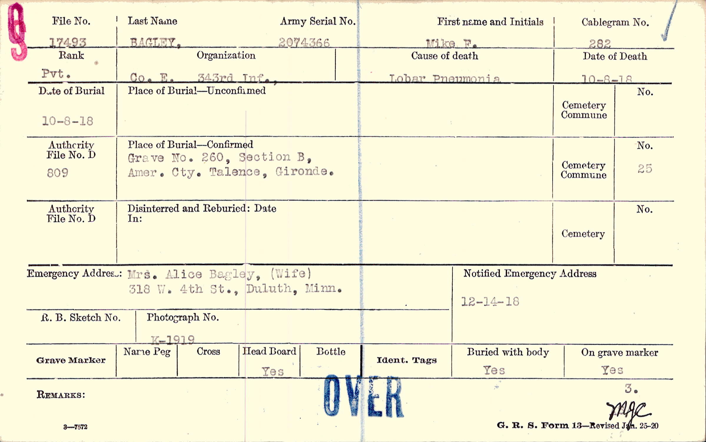 Mrs. Alice Bagley, (Wife), 318 W. 4th St., Duluth, Minn.