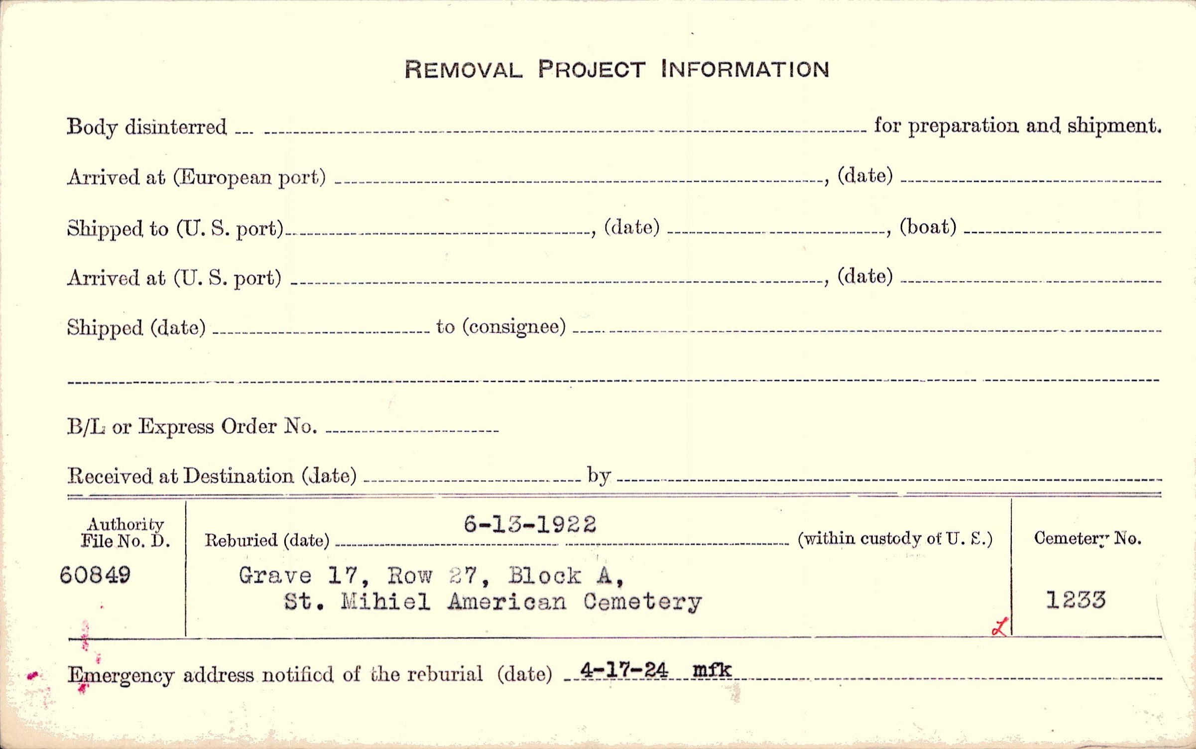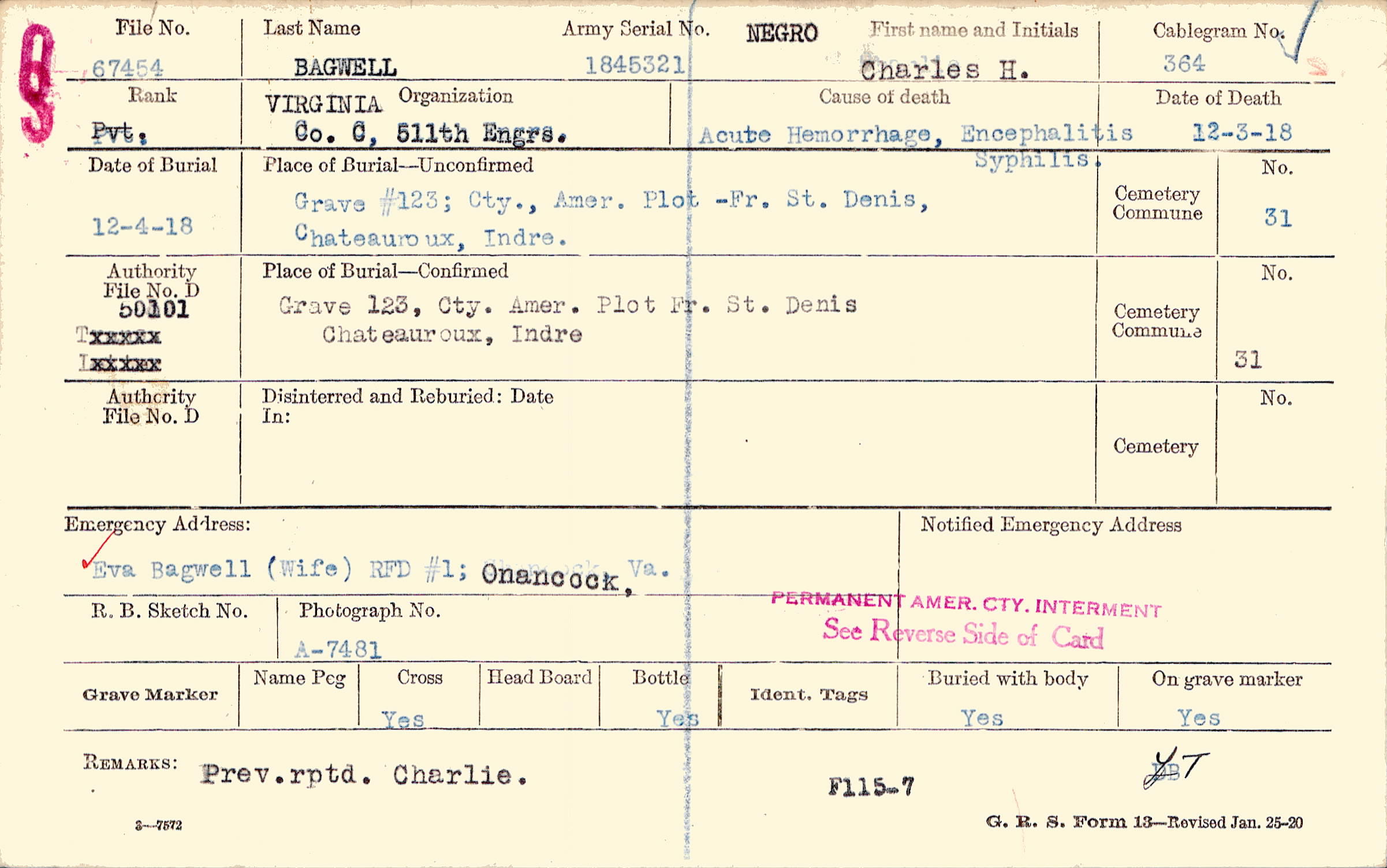 Grave 123, Cty., Amer., Plot Ft. St. Denis, Chateaureux, Indre