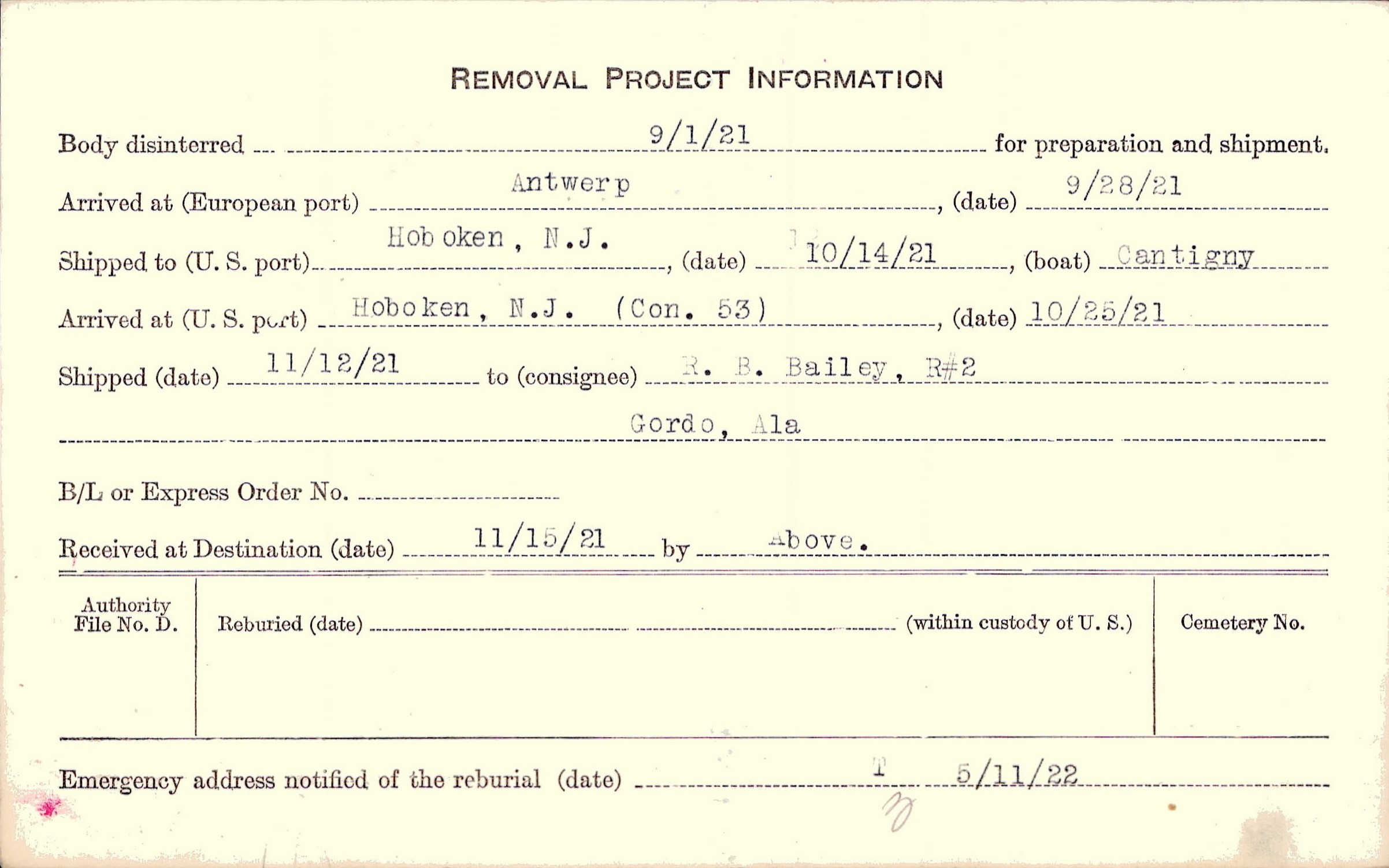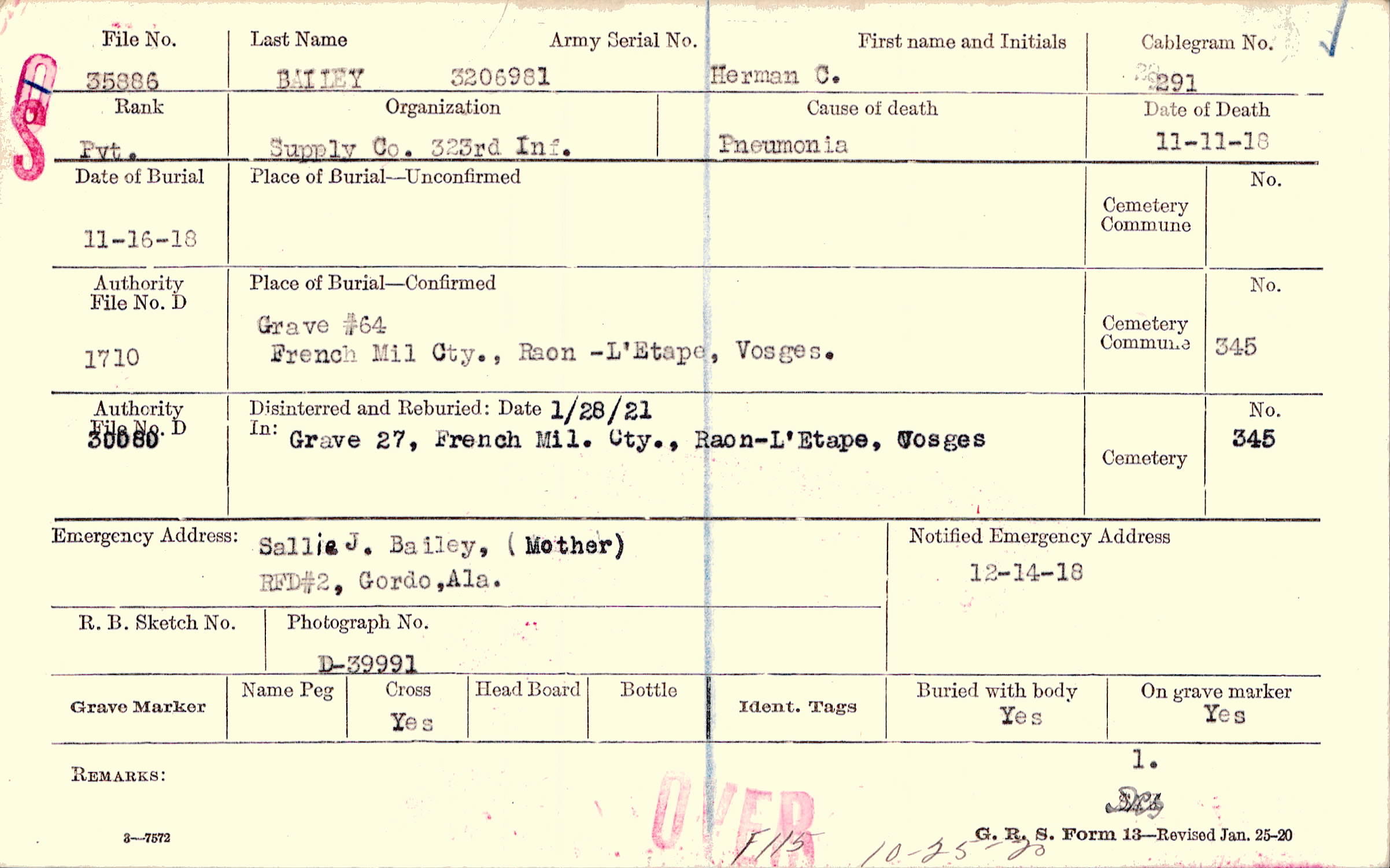 Sallie J. Bailey, (Mother), RFD#2, Gordo, Ala.