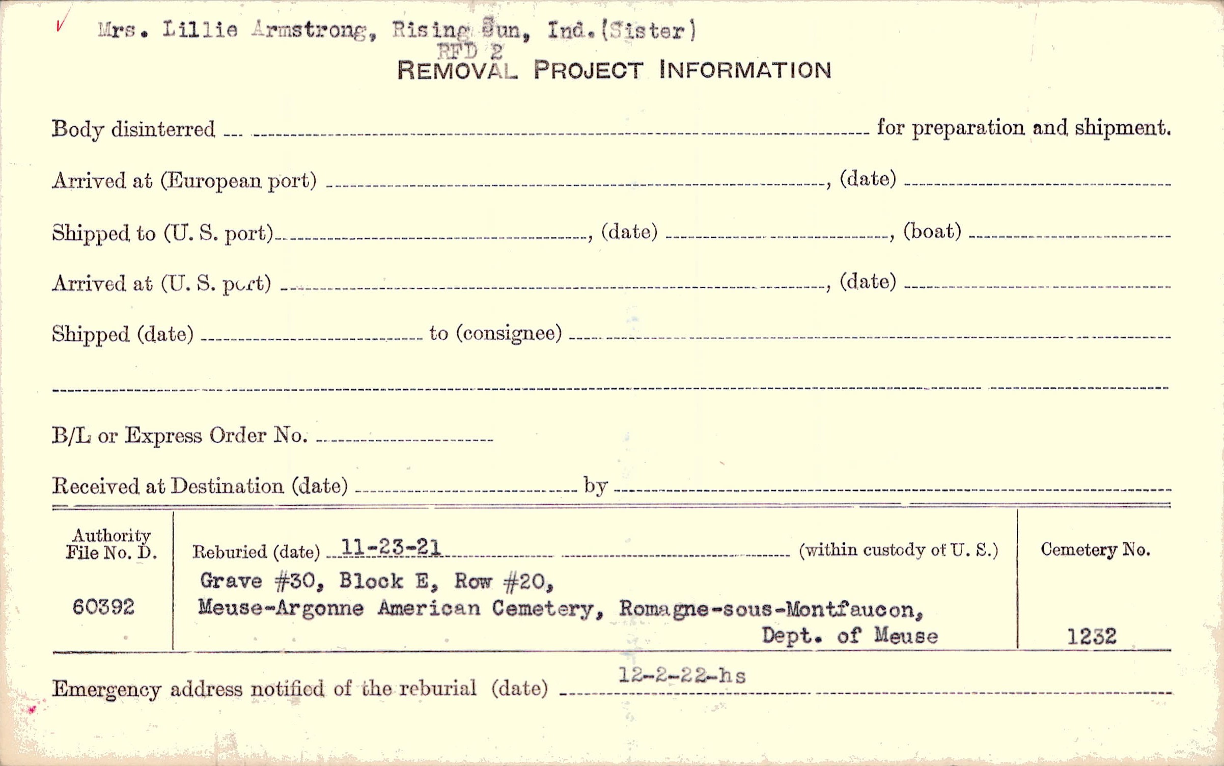 Mrs. Lillie Armstrong, Rising Sun, Ind., (Sister), RFD 2 |