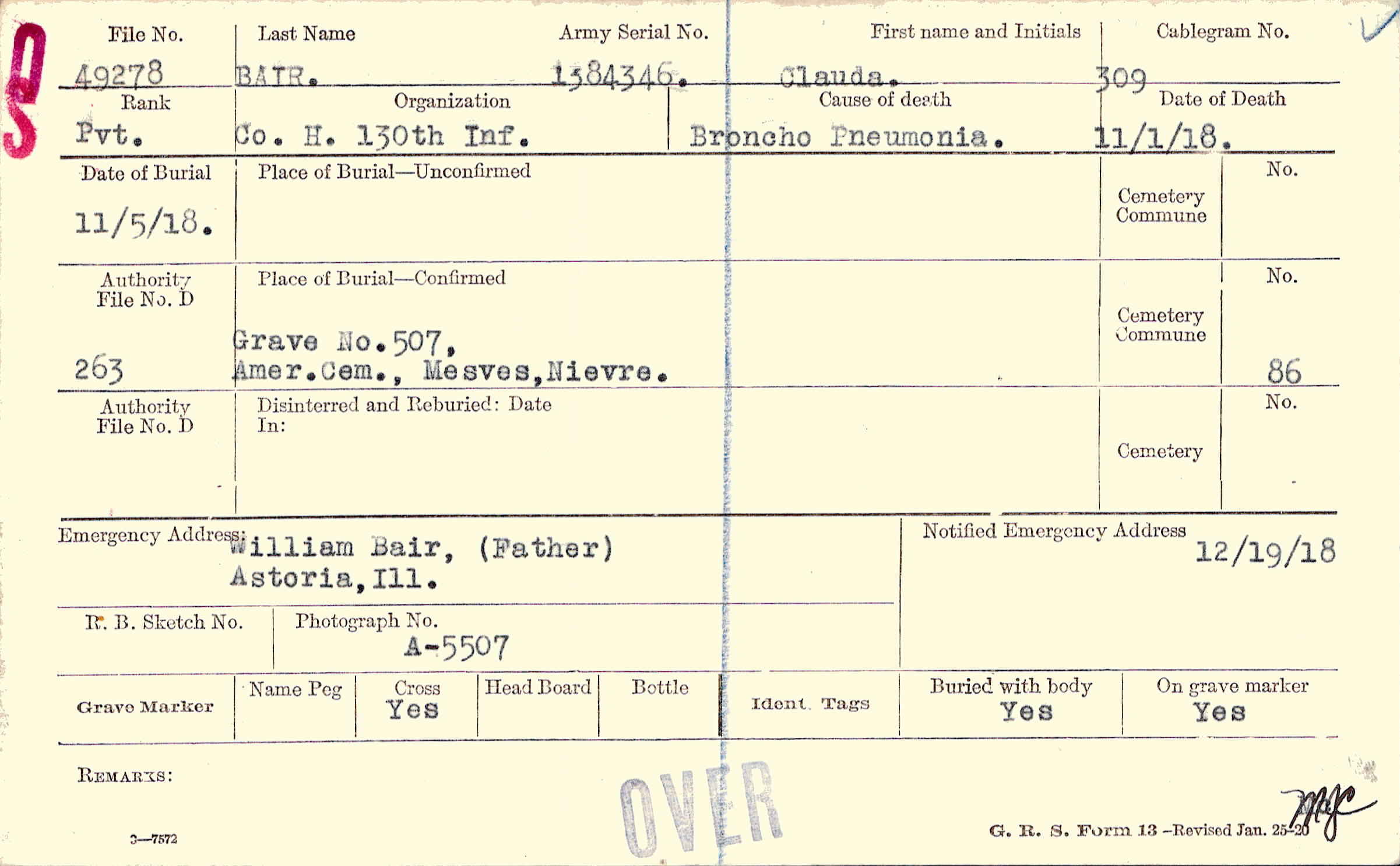 Grave 507, Amer. Cem., Mesves, Nievre.