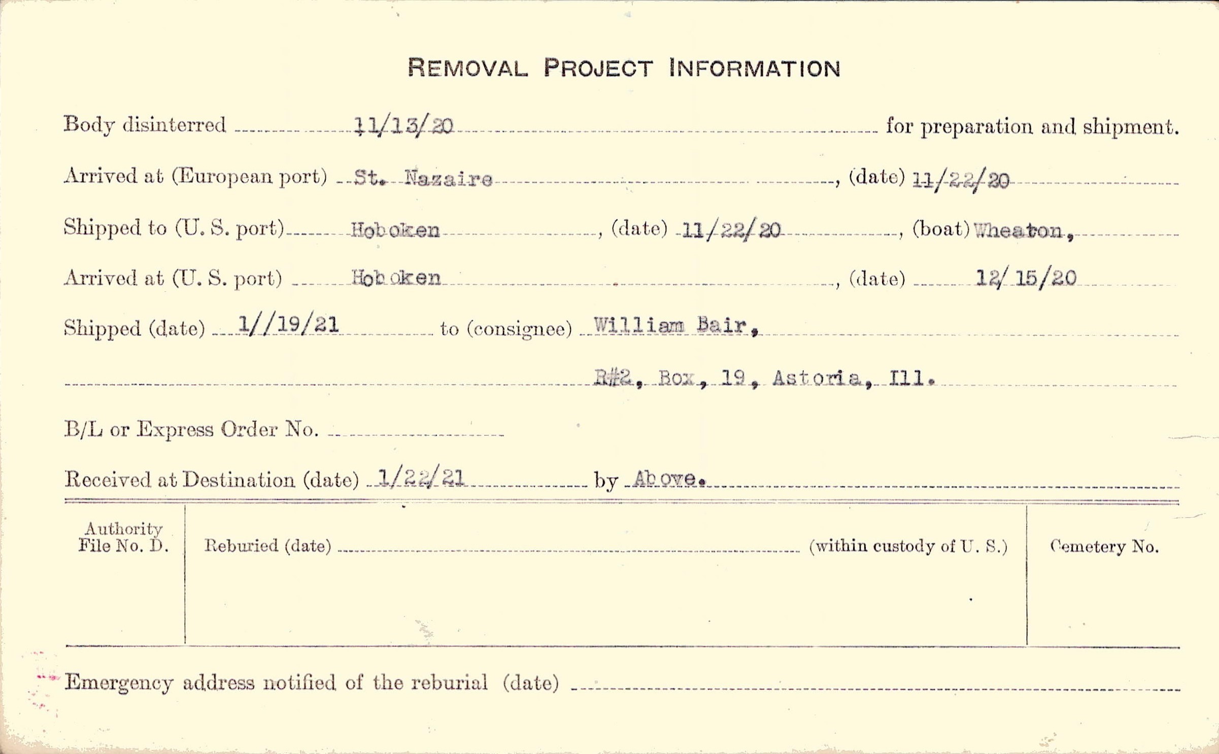 Body disinterred 11/13/1920 for preparation and shipment.