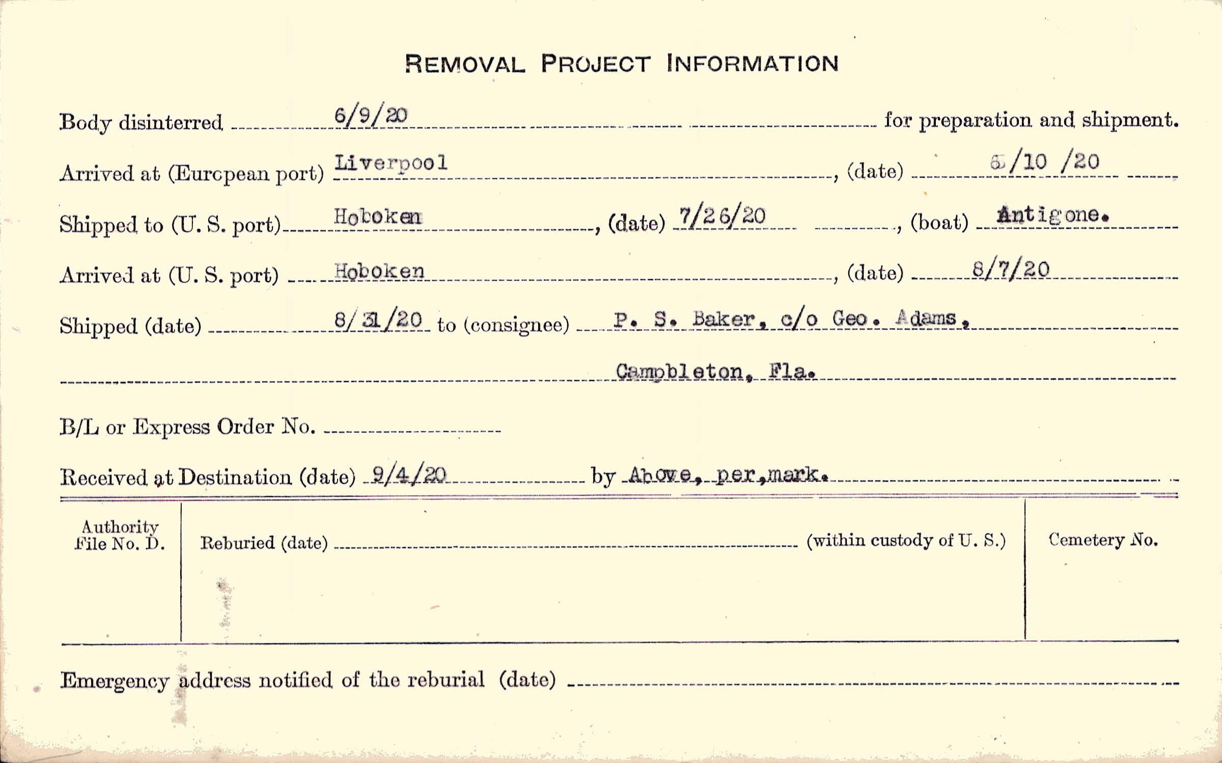 to P. S. Baker, c/o Geo. Adams, Campbleton, Fla.