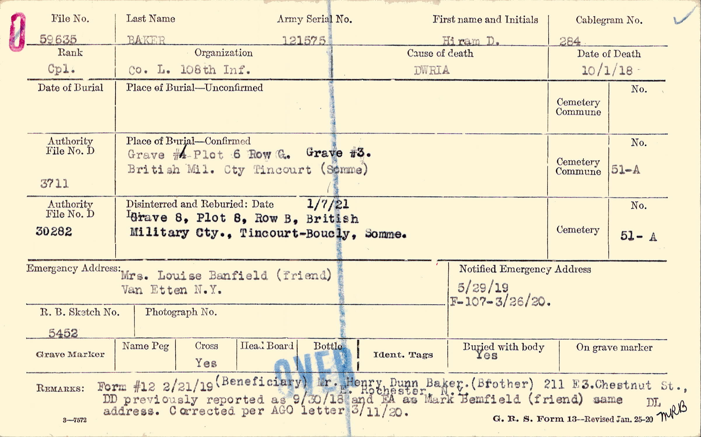 (Beneficiary) Mr. Henry Dunn Baker, (Brother) 211 E. Chestnut St., E. Rochester, N. Y. DD previously reports as 9/30/18 and EA as Mark Bemfield (friend) same address. Corrected per AGO letter 3/11/20, Form #12 2/21/19