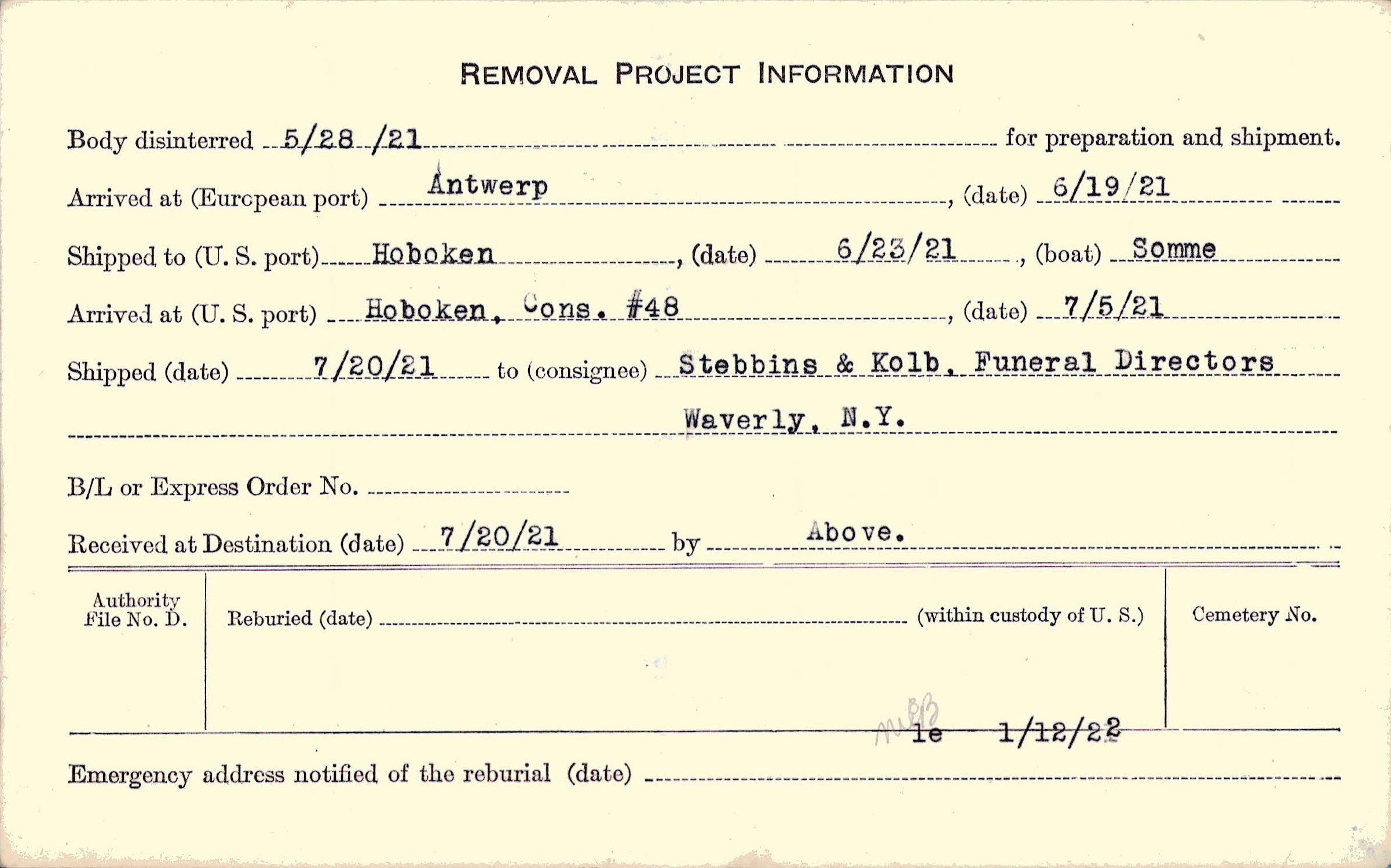 Body disinterred 5/28/1921 for preparation and shipment.