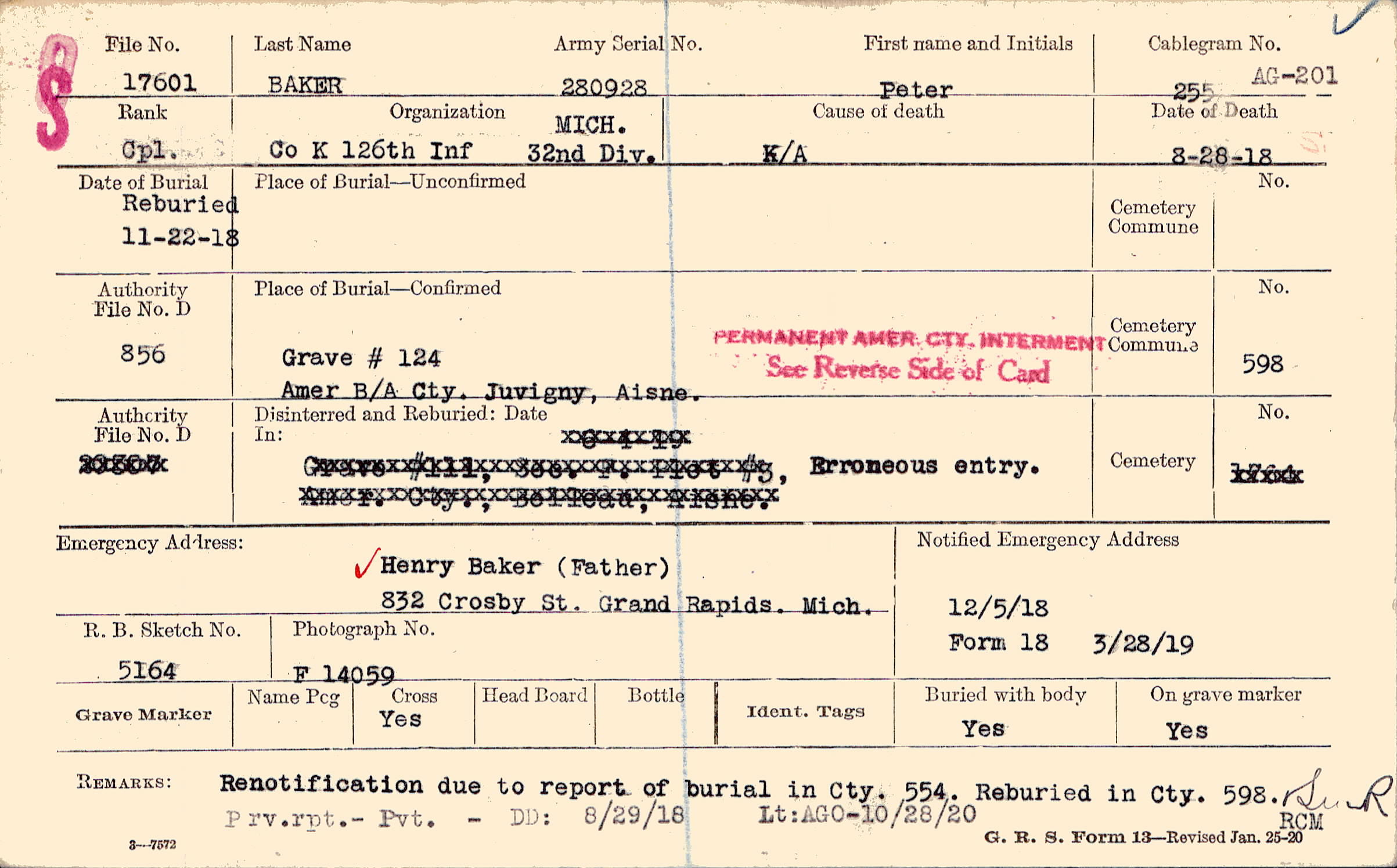 Renotification due to report of burial in Cty. 554. Reburied in Cty. 598. Prv. rpt. - Pvt. - DD: 8/29/18 Lt: AGO - 10/28/20