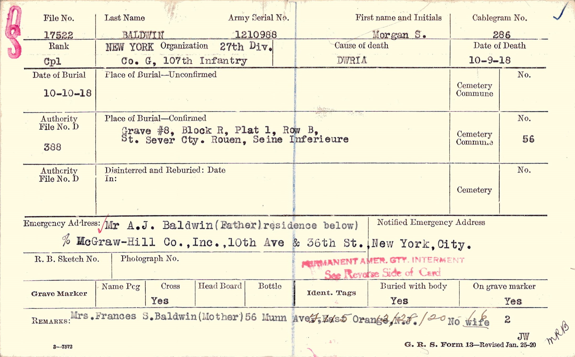 Mrs. Frances S. Baldwin (Mother) 56 Munn Ave., East Orange, N.J. No wife.