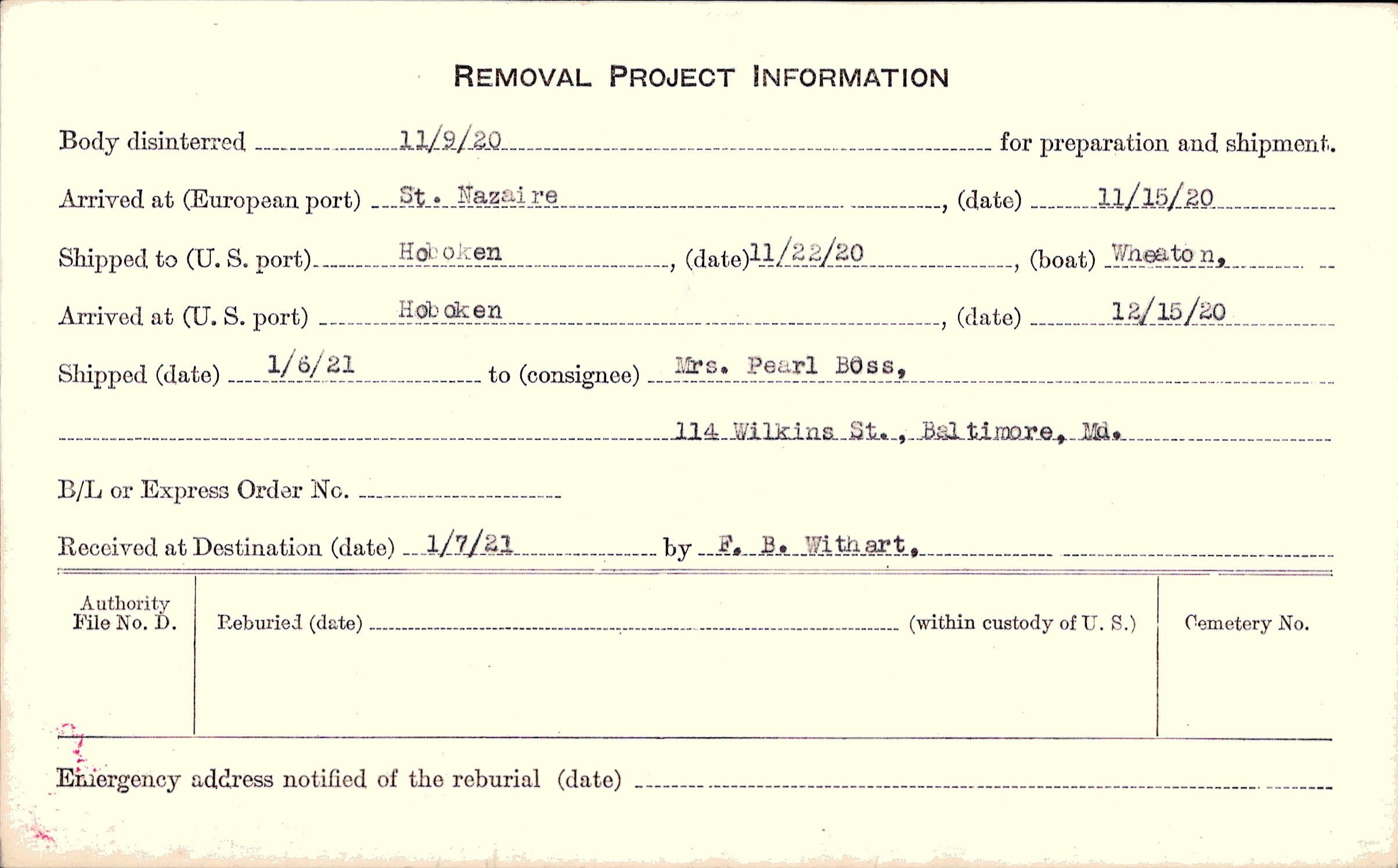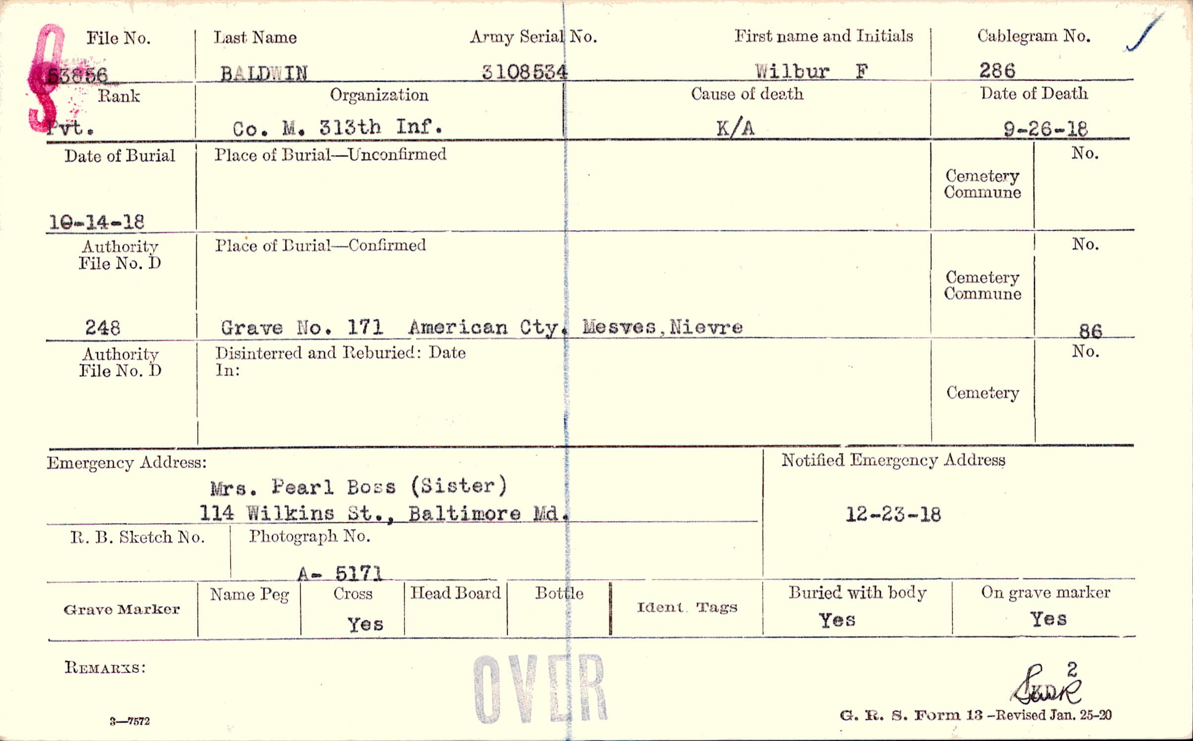 Mrs. Pearl Boss (Sister), 114 Wilkins St., Baltimore Md.
