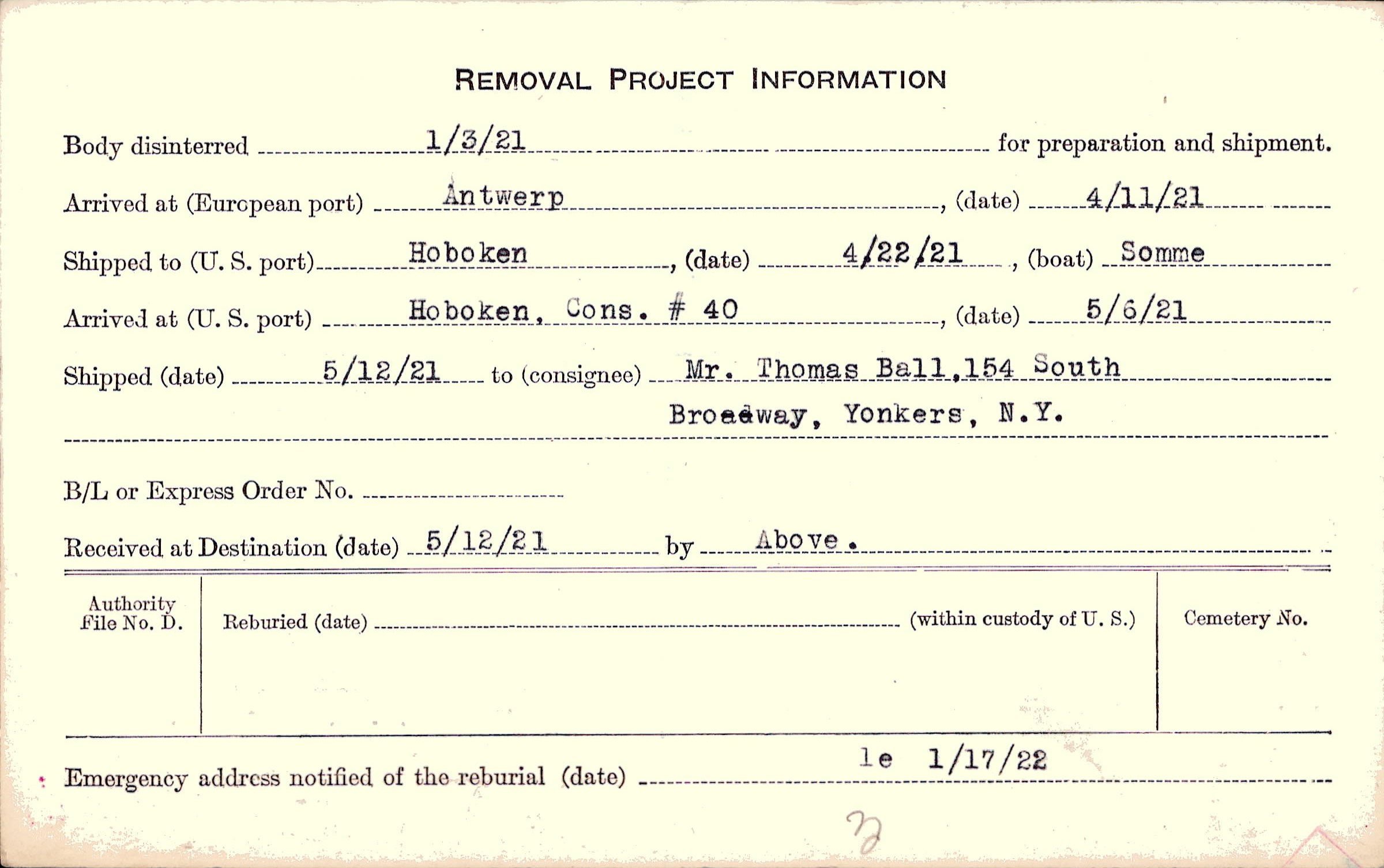 Body disinterred 1/3/1921 for preparation and shipment.