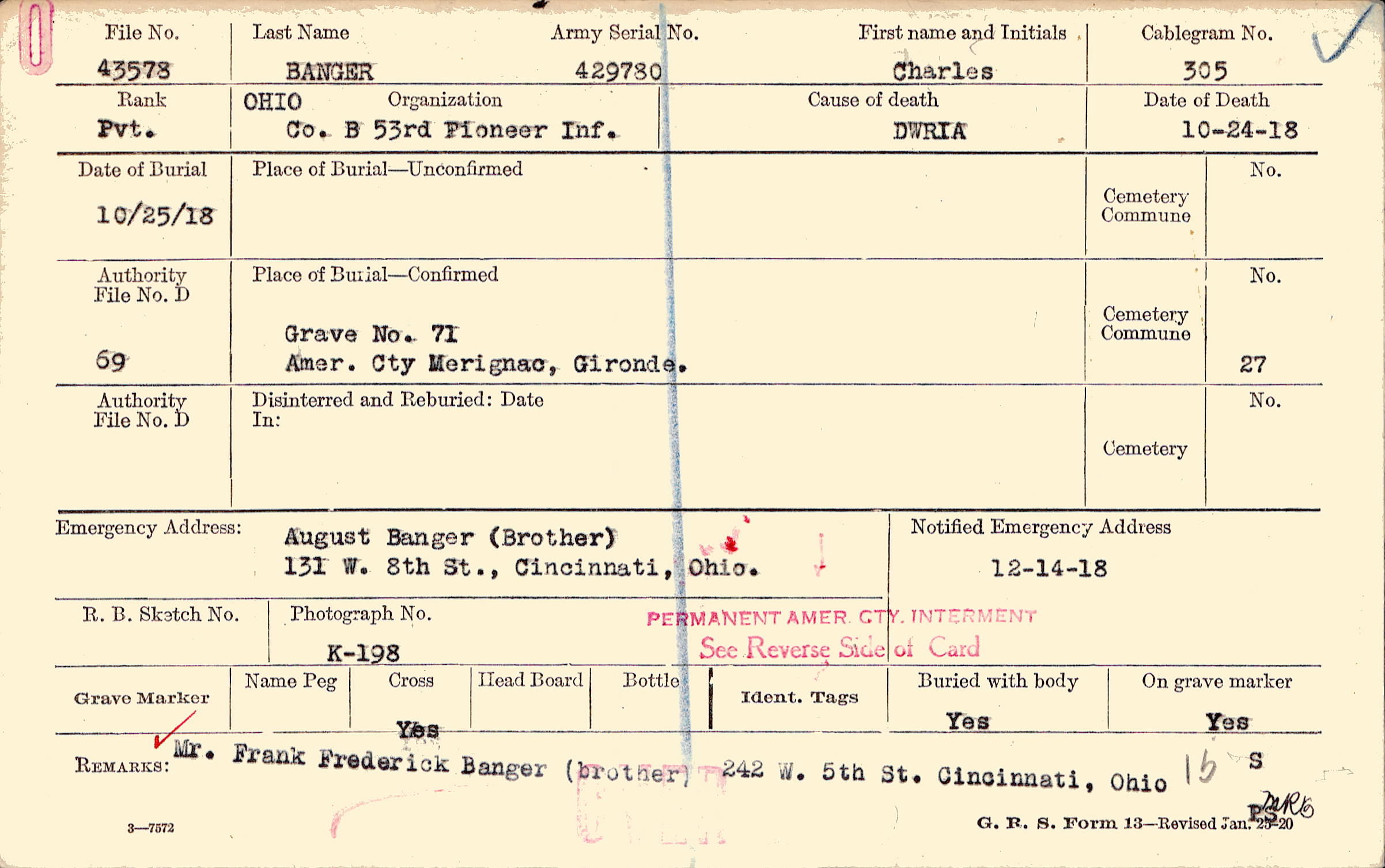 Mr. Frank Frederick Banger (brother) 242 W. 5th St. Cincinnati, Ohio