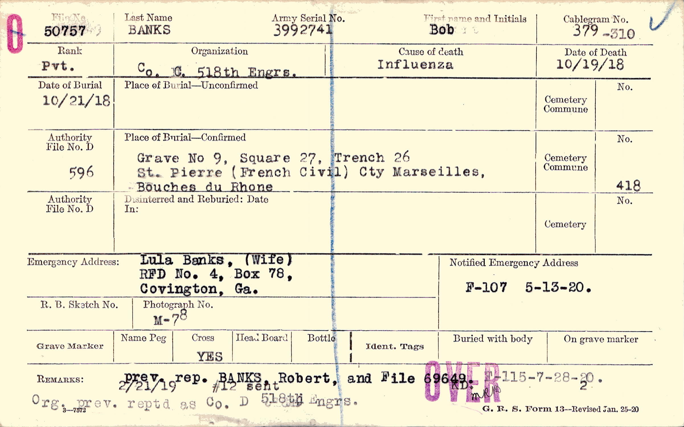 prev. rep. BANKS, Robert, and File 69649. Org. prev. reptd. as Co. D 518th Engrs., 2/21/19 #12 sent, F-115-7-28-20