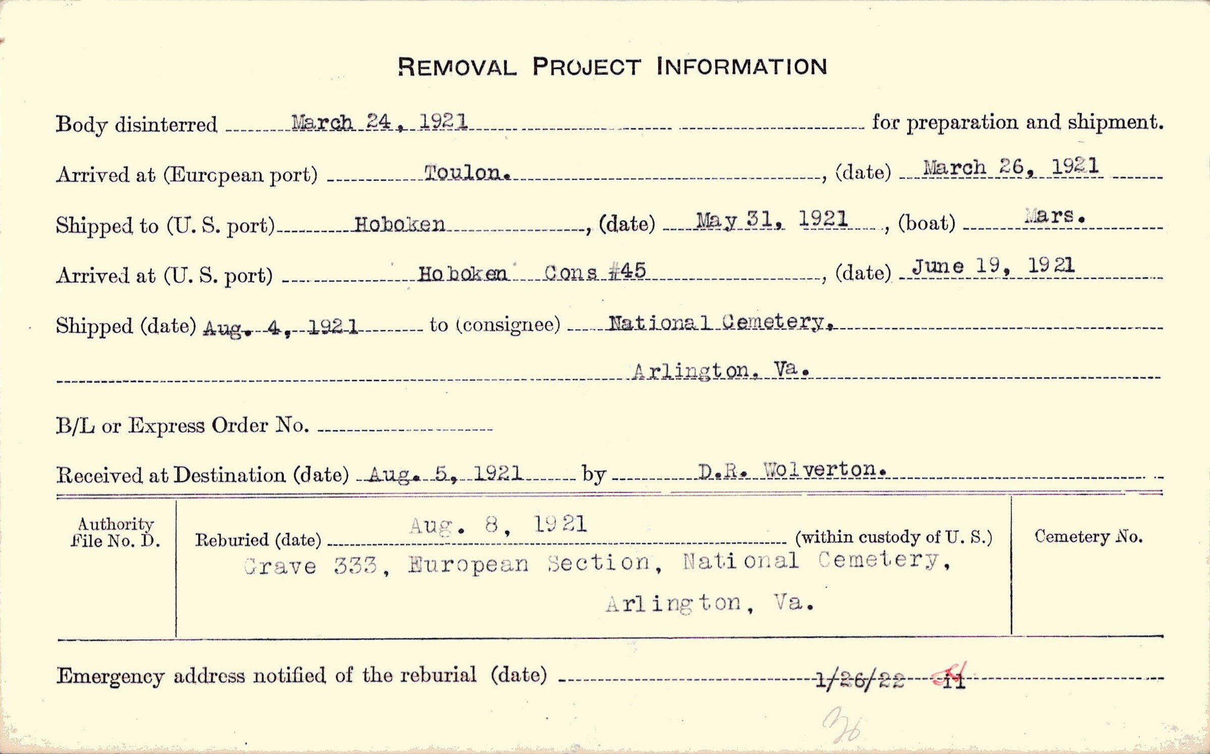 Body disinterred 3/24/1921 for preparation and shipment.