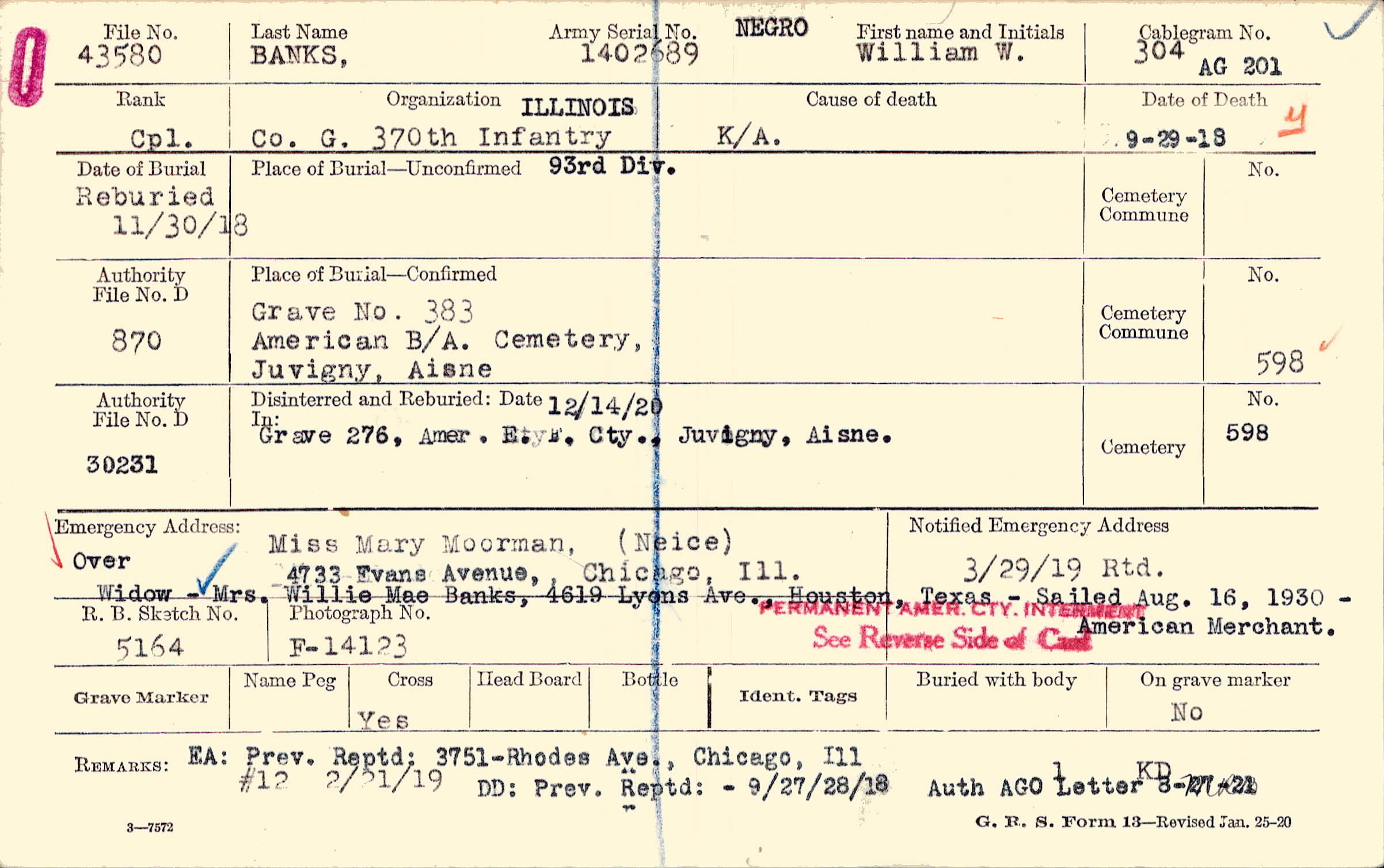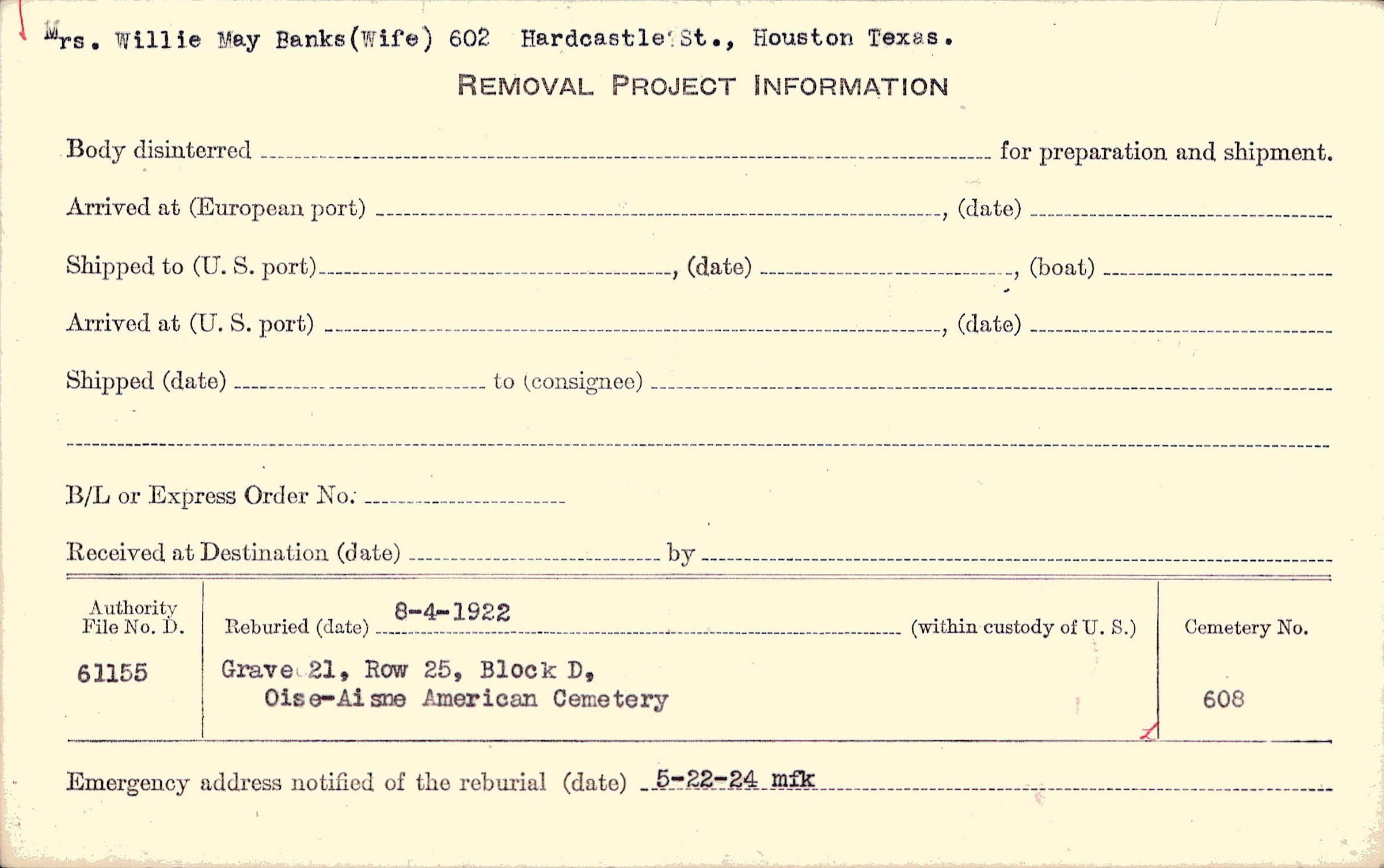 Mrs. Willie May Banks (Wife), 602 Hardcastle St., Houston, Texas |
