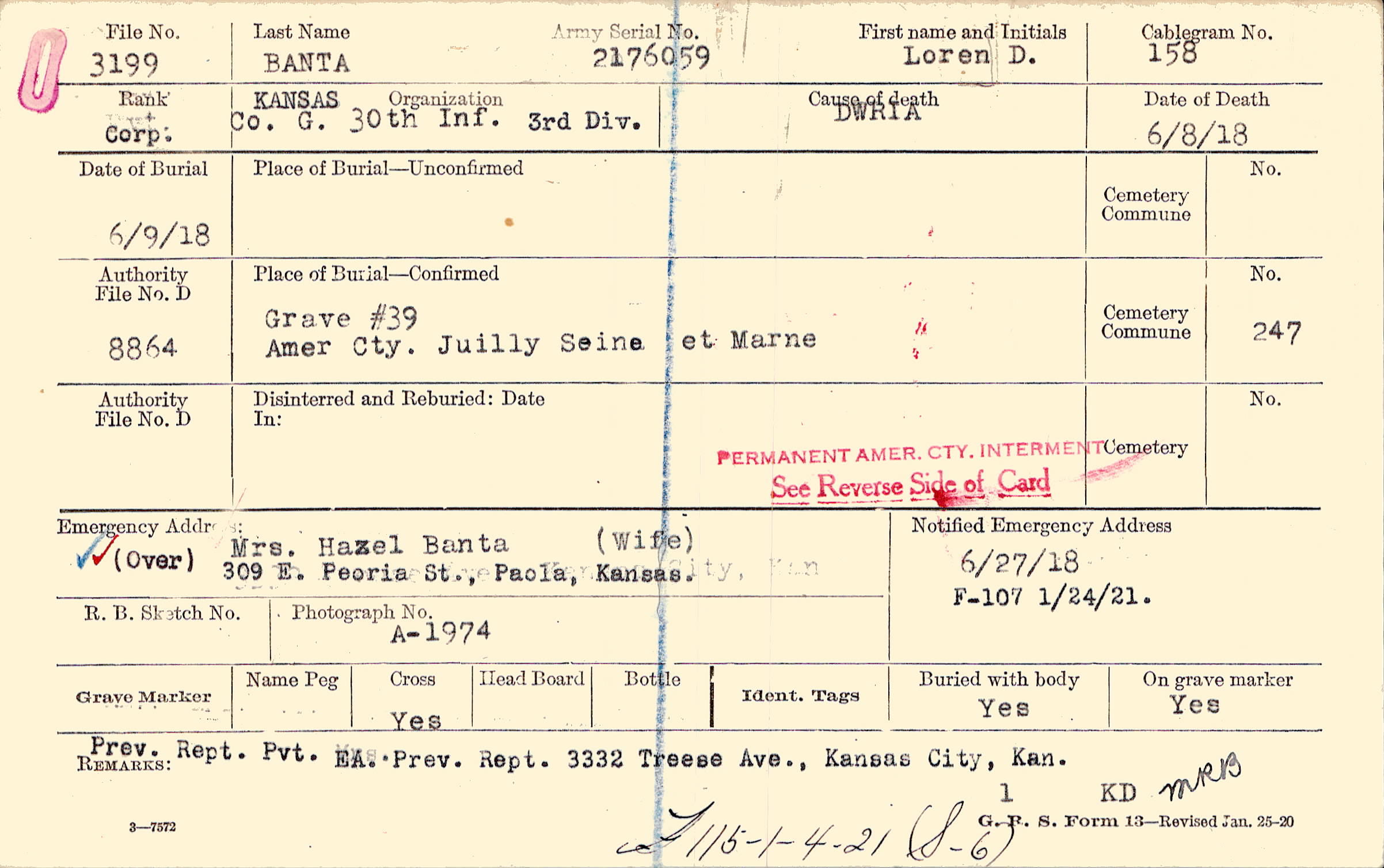 Mrs. Hazel Banta (Wife), 309 E. Peoria St., Paola, Kansas., (Over)