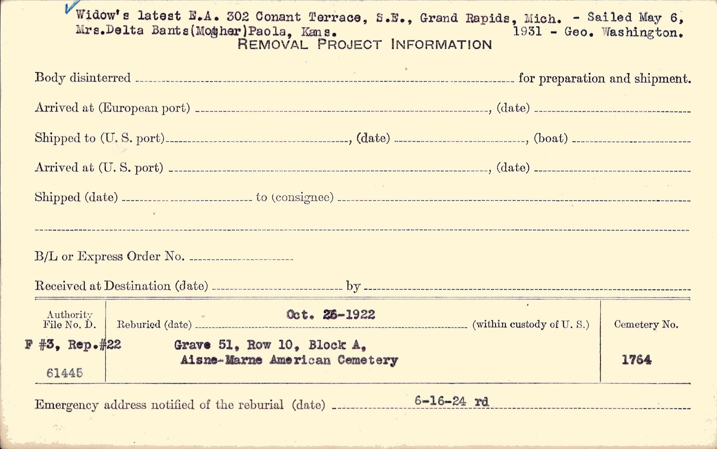 Widow's latest E.A. 302 Conant Terrace, S.E., Grand Rapids, Mich. - Sailed May 6, 1931 - Geo. Washington. Mrs. Delta Bents (Mother) Paola, Kans. |