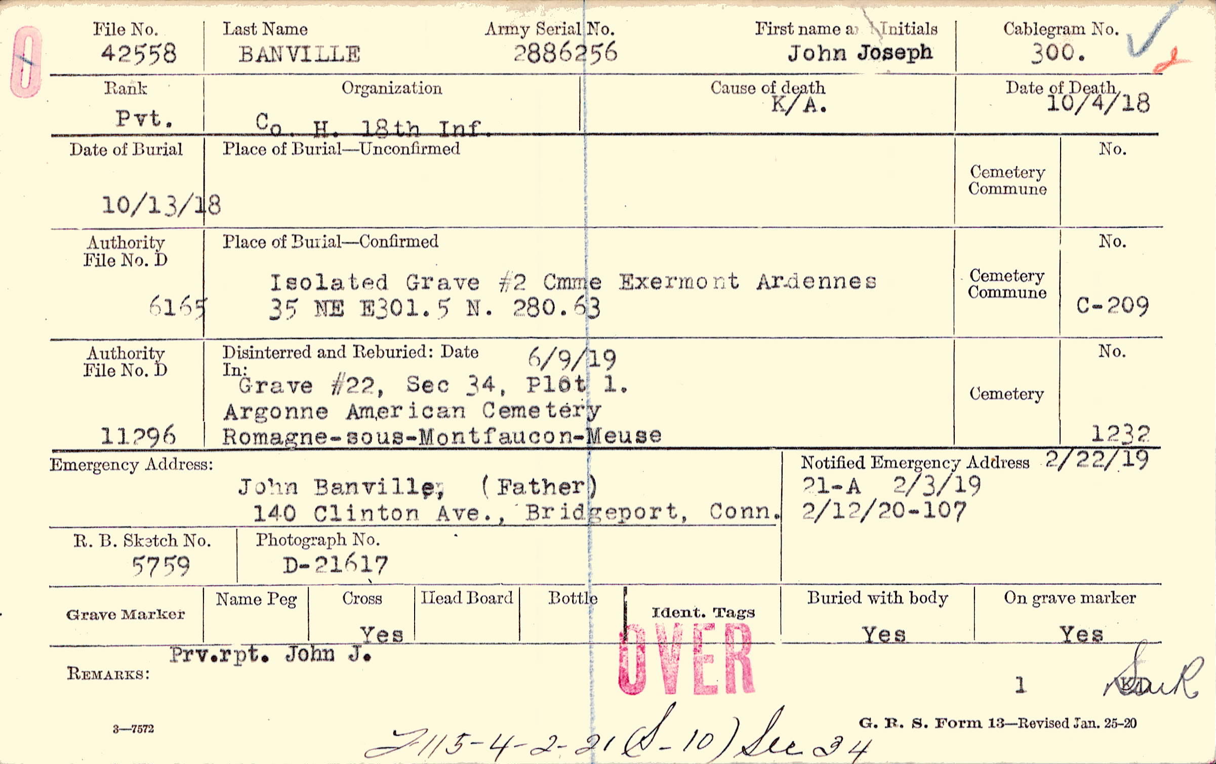 2/22/1919; Form 21A: 2/3/1919; Form 107: 2/12/1920